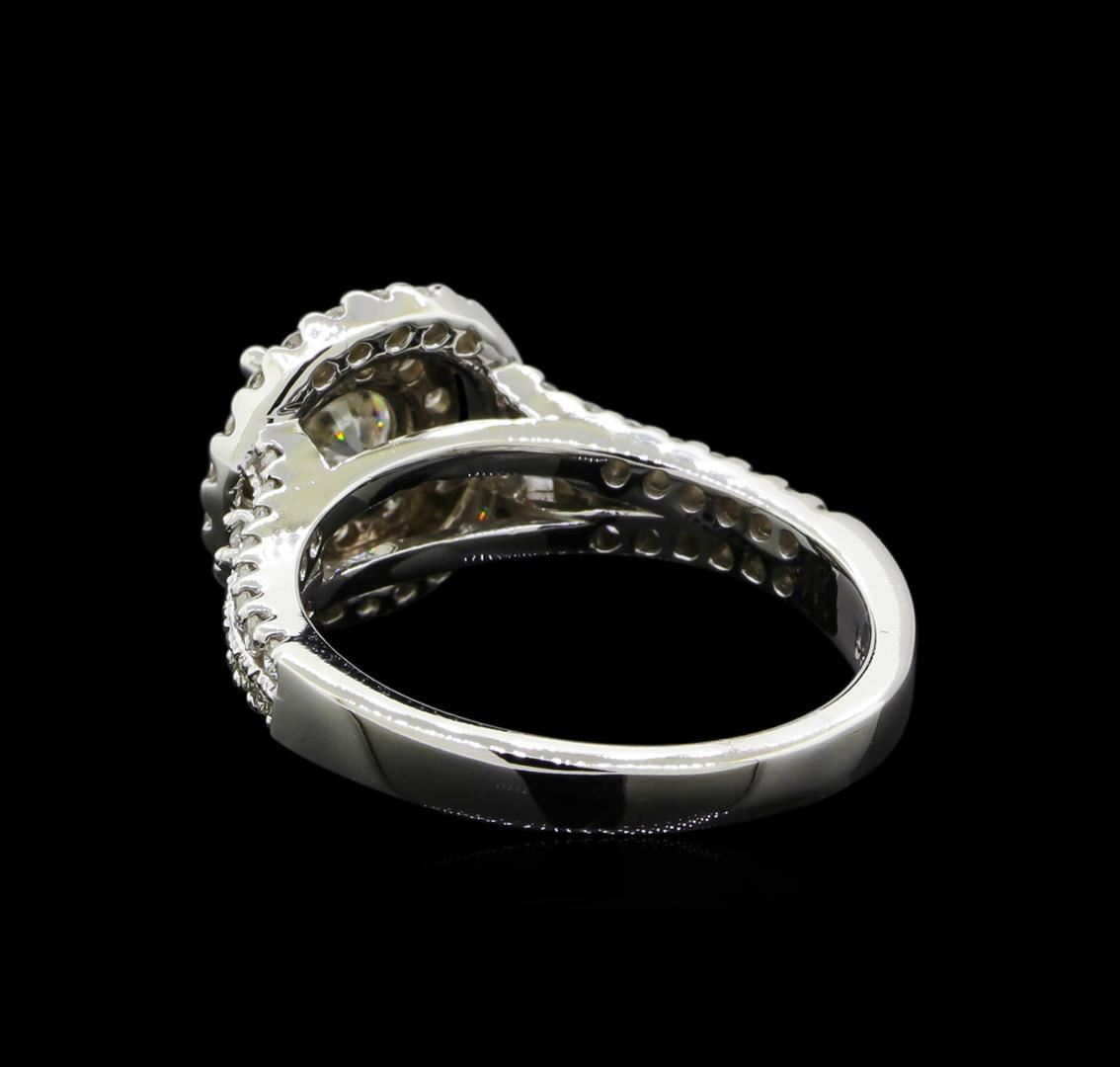 One electronically tested 14KT white gold lady's cast wedding ring with a double halo with a bright polish with milgrain detailing finish. The featured lady's ring has a shank measuring 2.63 millimeters wide. Identified with markings of '585'. Condition is new, good workmanship. Containing: One prong set round brilliant cut diamond, measuring 5.15 - 5.12 x 3.21mm (depth est.) approximate weight of 0.51ct. Graded in the setting. Clarity I-1. Color: F - G Cut Very Good Ten prong set round brilliant cut diamonds, measuring 1.90 - 1.80 x 1.11mm (depth est.) approximate total weight of 10 Stones = 0.23ct. Graded in the setting. Clarity VS-2 to SI-2. Color: G - H Cut Good Fifty-Six prong set round brilliant cut diamonds, measuring 1.35 - 1.25 x 0.79mm (depth est.) approximate total weight of 56 Stones = 0.46ct. Graded in the setting. Clarity SI-1 to I-1. Color: H - I Cut Good. Total Weight of Diamonds 1.20ct.. Total Weight of Ring 5.00gm. GAS Appraised at $6,240.00.
