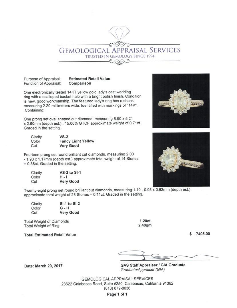 One electronically tested 14KT yellow gold lady's cast wedding ring with a scalloped basket halo with a bright polish finish. The featured lady's ring has a shank measuring 2.20 millimeters wide. Identified with markings of '14K'. Condition is new, good workmanship. Containing: One prong set oval shaped cut diamond, measuring 6.90 x 5.21 x 2.60mm (depth est.) , 15.00.%. GTCF approximate weight of 0.71ct. Graded in the setting. Color Fancy Light Yellow Clarity VS-2 Cut Very Good Fourteen prong set round brilliant cut diamonds, measuring 2.00 - 1.90 x 1.17mm (depth est.) approximate total weight of 14 Stones = 0.38ct. Graded in the setting. Color H - I Clarity VS-2 to SI-1 Cut Very Good Twenty-Eight prong set round brilliant cut diamonds, measuring 1.10 - 0.95 x 0.62mm (depth est.) approximate total weight of 28 Stones = 0.11ct. Graded in the setting. Color G - H Clarity SI-1 to SI-2 Cut Very Good. Total Weight of Diamonds 1.20 ct.. Total Weight of Ring 2.40gm GAS Appraised.