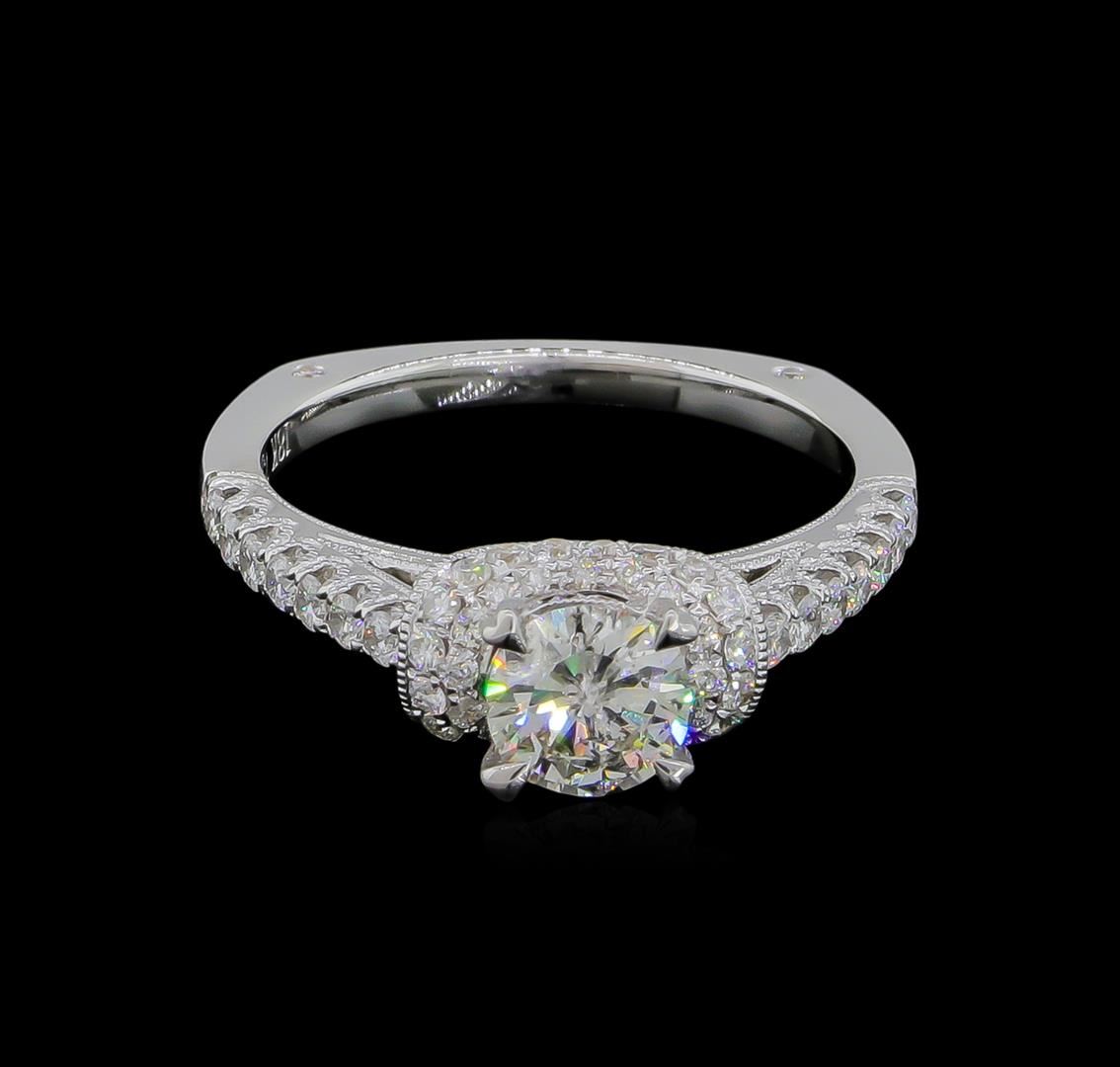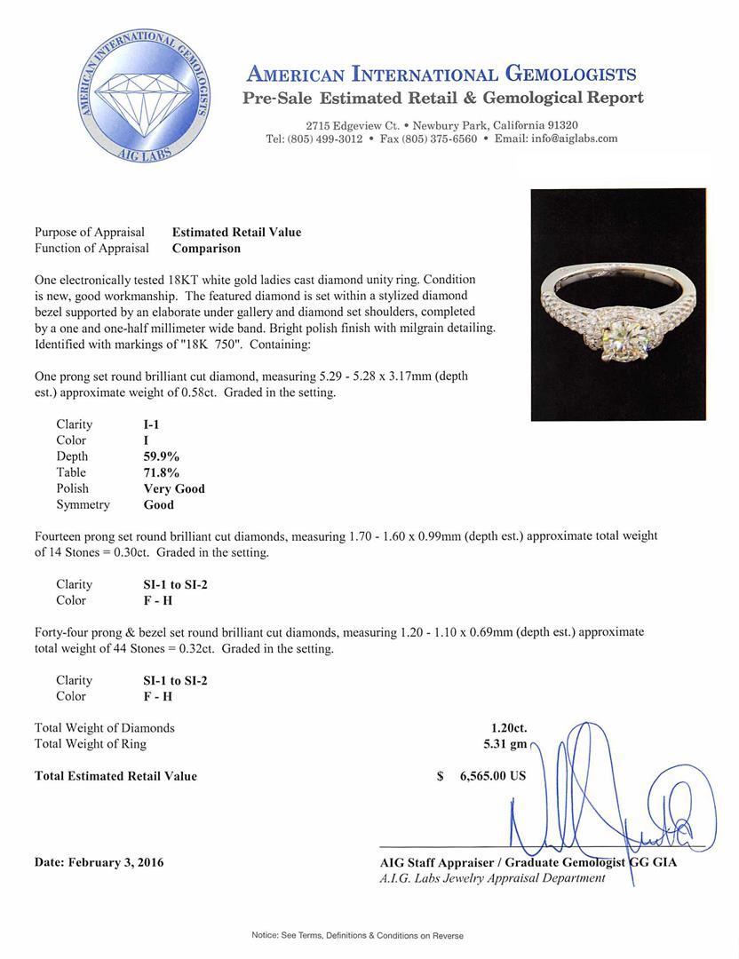 One electronically tested 18KT white gold ladies cast diamond unity ring. The featured diamond is set within a stylized diamond bezel supported by an elaborate under gallery and diamond set shoulders, completed by a one and one-half millimeter wide band. Bright polish finish with milgrain detailing. Identified with markings of "18K 750". Condition is new, good workmanship. Containing: One prong set round brilliant cut diamond, measuring 5.29 - 5.28 x 3.17mm (depth est.) approximate weight of 0.58ct. Graded in the setting. Clarity: I-1. Color: I. Depth 59.9%. Table 71.8%. Fourteen prong set round brilliant cut diamonds, measuring 1.70 - 1.60 x 0.99mm (depth est.) approximate total weight of 14 Stones = 0.30ct. Graded in the setting. Clarity: SI-1 to SI-2. Color: F - H Forty-Four prong & bezel set round brilliant cut diamonds, measuring 1.20 - 1.10 x 0.69mm (depth est.) approximate total weight of 44 Stones = 0.32ct. Graded in the setting. Clarity: SI-1 to SI-2. Color: F - H. Total Weight of Diamonds 1.20ct. Total Weight of Ring 5.31gm. AIG Appraised at $6,565.00.