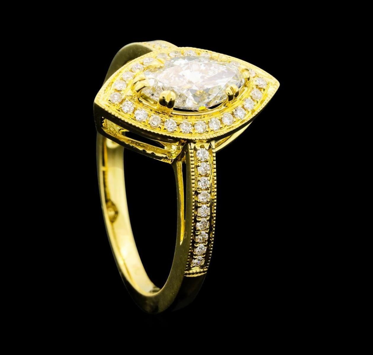 One electronically tested 18KT yellow gold lady's cast wedding ring with a basket halo with cathedral shank with a bright polish with milgrain detailing finish. The featured lady's ring has a shank measuring 1.89 millimeters wide. Identified with markings of '18K'. Condition is new, good workmanship. Containing: One prong set marquise shaped cut diamond, measuring 8.75 x 4.90 x 3.85mm (depth est.) , 5.00.%. GTCF approximate weight of 1.00ct. Graded in the setting. Clarity I-1. Color: I - J Cut Good Forty-Two prong set round brilliant cut diamonds, measuring 1.10 - 1.05 x 0.67mm (depth est.) approximate total weight of 42 Stones = 0.20ct. Graded in the setting. Clarity SI-1 to I-1. Color: G - H Cut Good. Total Weight of Diamonds 1.20ct.. Total Weight of Ring 3.90gm. GAS Appraised.