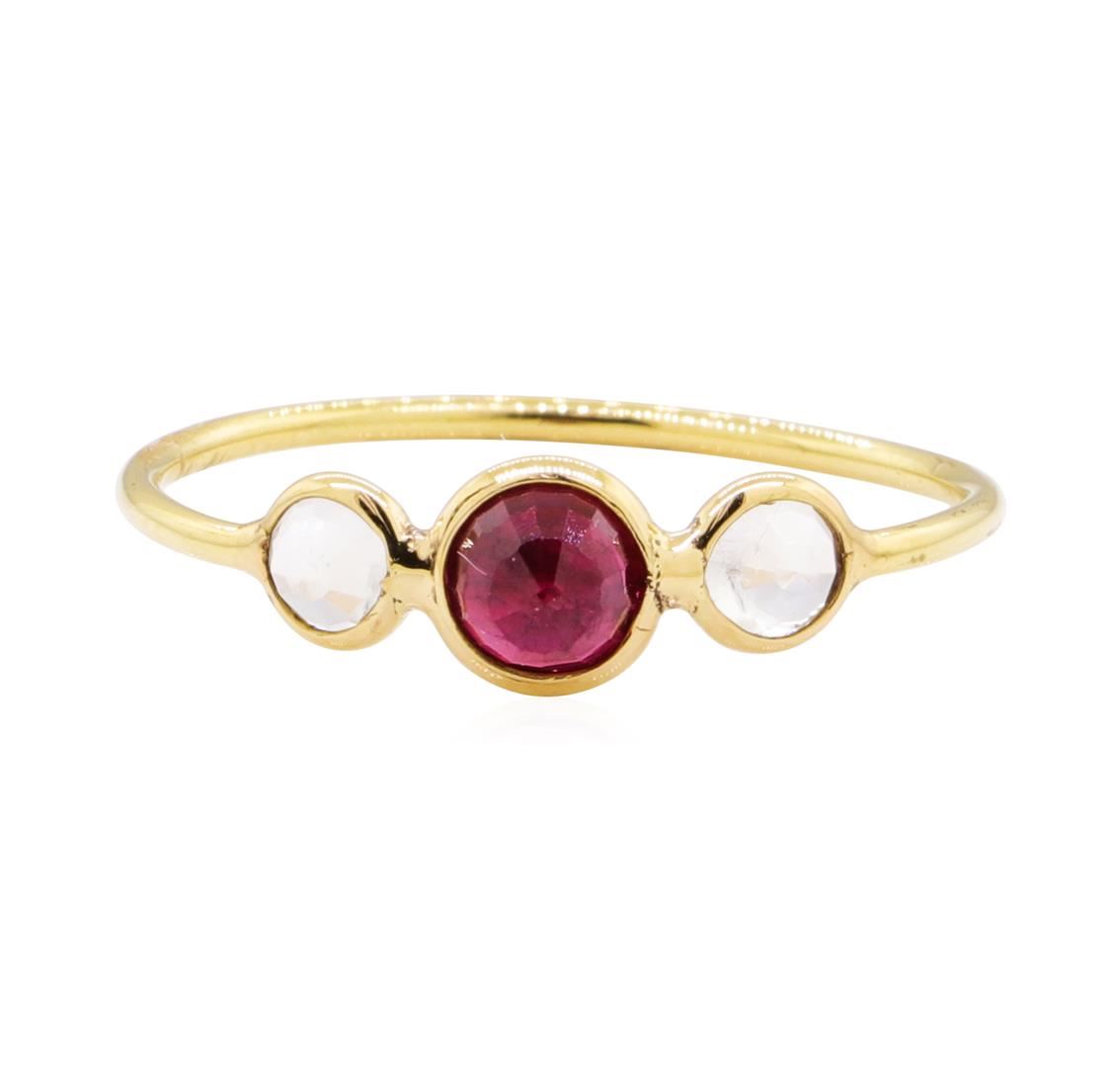One ring featuring: 18KT yellow gold weighing 1.0 grams containing one ruby weighing 0.80 ct and two moonstones weighing 0.40 ctw.