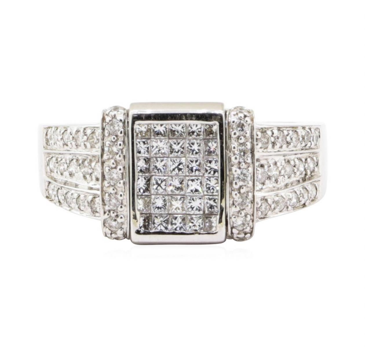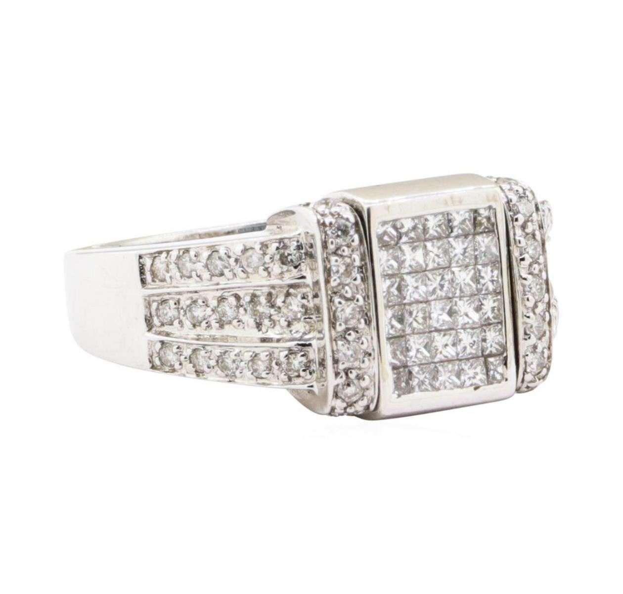 One electronically tested 14KT white gold lady's combination cast & assembled fashion ring with a reversible top with a bright polish finish. The featured lady's ring has a shank measuring 3.00 millimeters wide. Identified with markings of '14K'. Condition is new, good workmanship. Containing: Thirty invisible set princess cut treated diamonds, measuring 1.40 x 1.40 x 1.05mm (depth est.) approximate total weight of 30 Stones = 0.44ct. Colored gemstones are presumed to have been subjected to commonly used enhancement processes. Graded in the setting. Color Fancy Greenish Blue Clarity VS-2 to SI-1 Cut Very Good Thirty invisible set princess cut diamonds, measuring 1.40 x 1.40 x 1.05mm (depth est.) approximate total weight of 30 Stones = 0.43ct. Graded in the setting. Color H - I Clarity VS-2 to SI-1 Cut Very Good Forty-Eight prong set round brilliant cut diamonds, measuring 1.30 - 1.20 x 0.75mm (depth est.) approximate total weight of 48 Stones = 0.33ct. Graded in the setting. Color H - I Clarity SI-2 to I-1 Cut Good. Total Weight of Diamonds 1.20 ct.. Total Weight of Ring 7.90gm GAS Appraised at $5420.00. GAS Appraised.