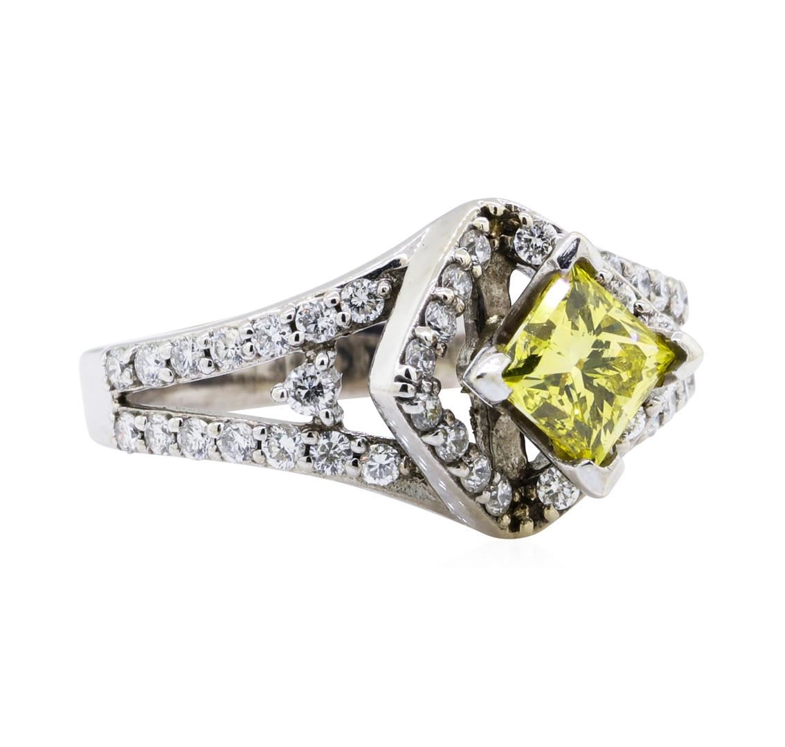 One electronically tested 14KT white gold lady's combination cast & assembled wedding ring with a split shank halo with a bright polish finish. The featured lady's ring has a shank measuring 2.25 millimeters wide. Identified with markings of '14K'. Condition is like new, good workmanship. Containing: One prong set princess cut treated diamond, measuring 4.68 x 4.59 x 3.78mm (depth est.) , 6.00.%. GTCF approximate weight of 0.72ct. Colored gemstones are presumed to have been subjected to commonly used enhancement processes. Graded loose prior to setting in the IGI Laboratory, Report #33261934. Color Fancy Yellow Clarity SI-1 Cut Very Good Two prong set round brilliant cut diamonds, measuring 1.70 - 1.65 x 1.04mm (depth est.) approximate total weight of 2 Stones = 0.04ct. Graded in the setting. Color G - H Clarity SI-1 to SI-2 Cut Very Good Forty-Four prong set round brilliant cut diamonds, measuring 1.40 - 1.35 x 0.86mm (depth est.) approximate total weight of 44 Stones = 0.44ct. Graded in the setting. Color G - H Clarity SI-1 to SI-2 Cut Good. Total Weight of Diamonds 1.20ct.. Total Weight of Ring 3.90gm GAS Appraised at $4120.00. GAS Appraised at $4,120.00.
