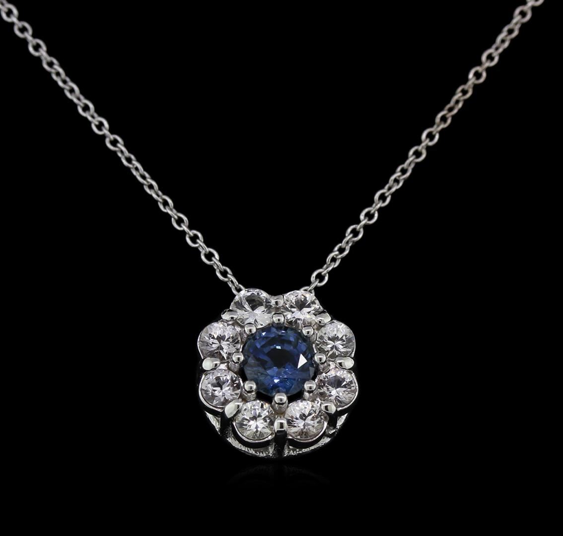One pendant with chain featuring: 14KT white gold weighing 4.06 grams containing one round blue sapphire center stone with a total weight of 0.40ct and round white sapphires with a total weight of 0.80ct.