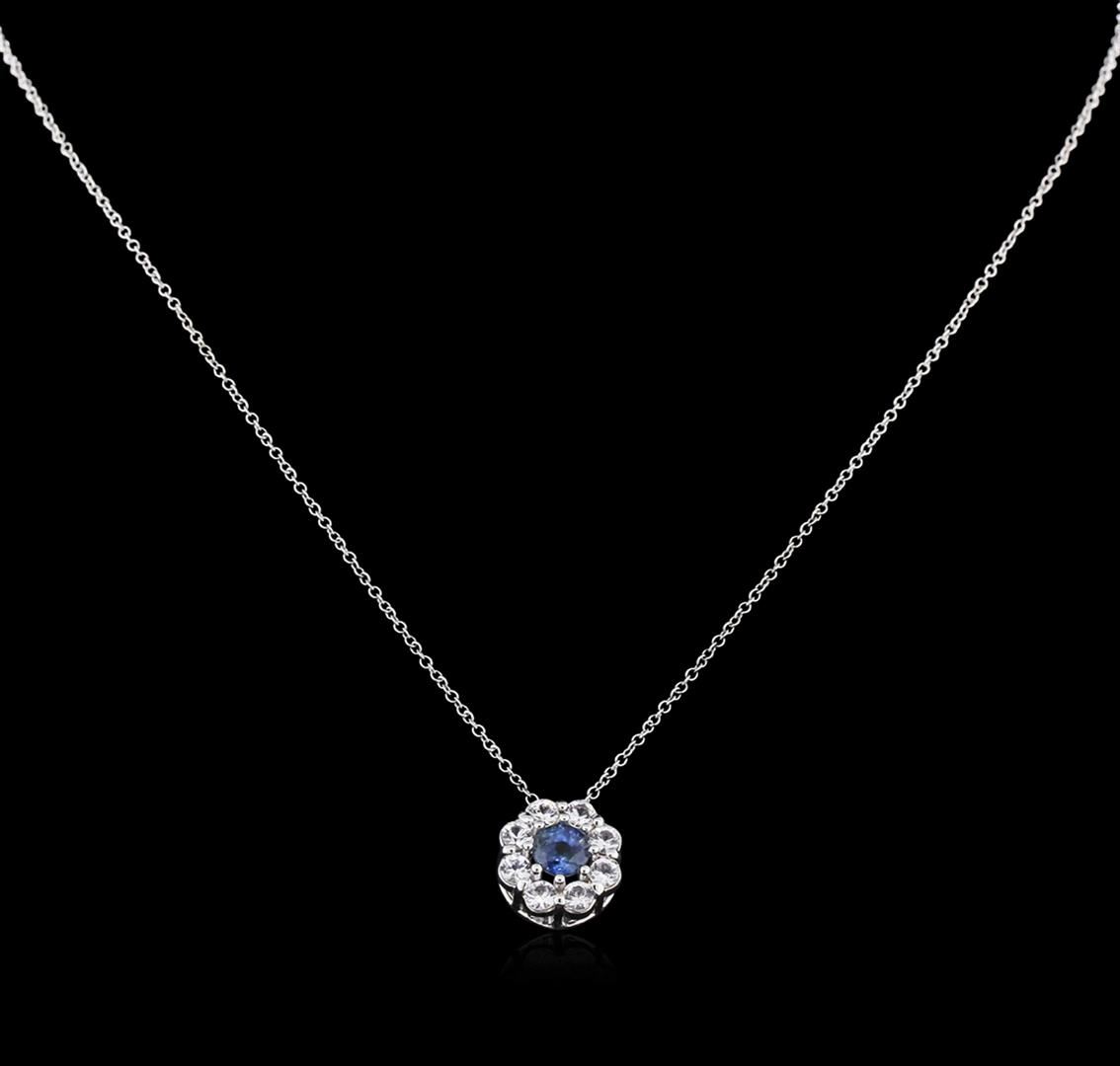 One pendant with chain featuring: 14KT white gold weighing 4.02 grams containing one round blue sapphire center stone with a total weight of 0.40ct and round white sapphires with a total weight of 0.80ct.