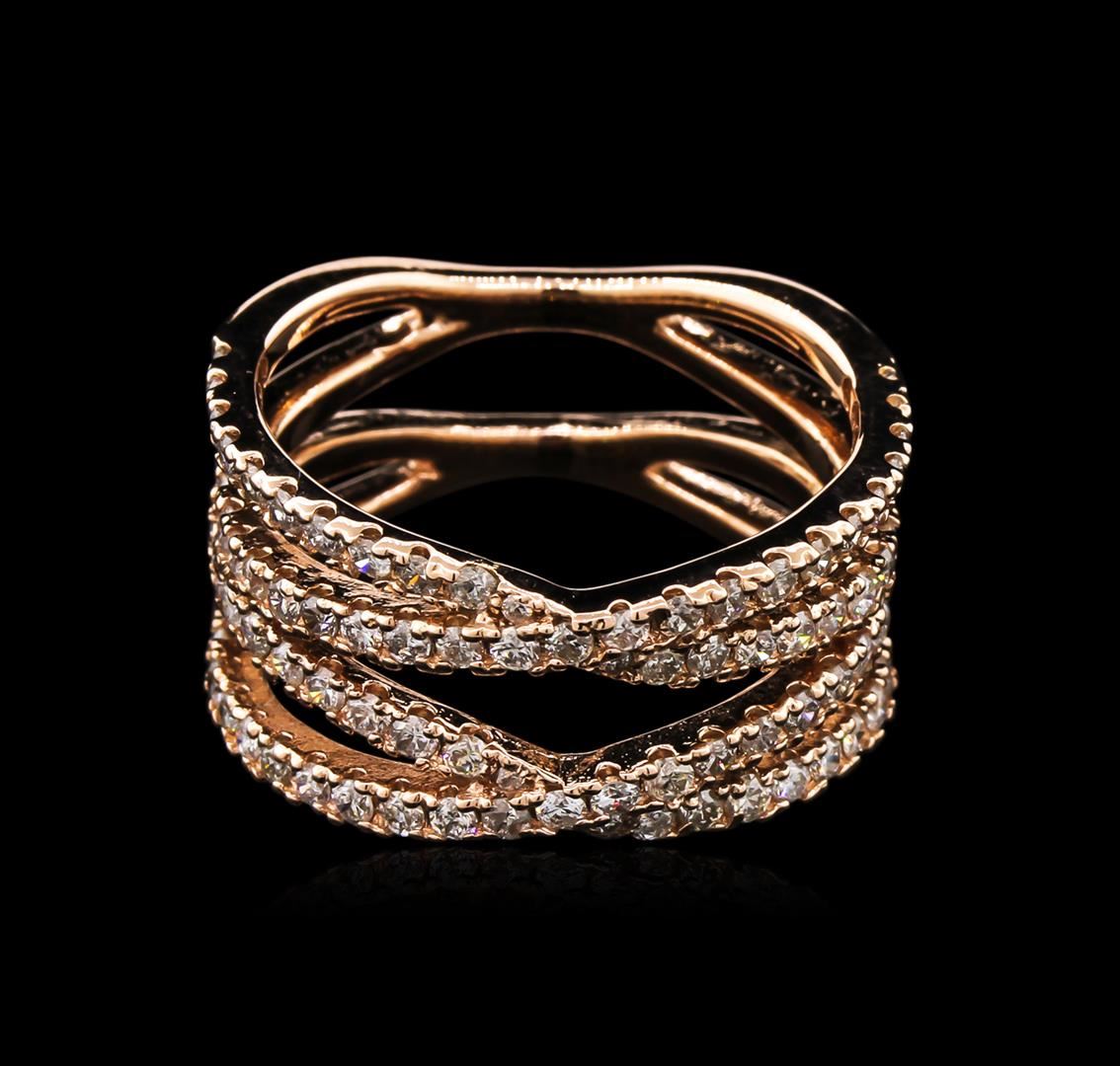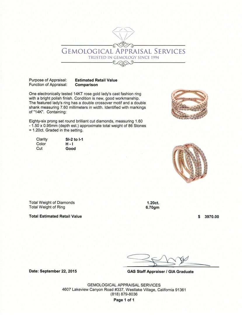 One electronically tested 14KT rose gold lady's cast fashion ring with a bright polish finish. The featured lady's ring has a double crossover motif and a double shank measuring 7.60 millimeters in width. Identified with markings of "14K". Condition is new, good workmanship. Containing: Eighty-Six prong set round brilliant cut diamonds, measuring 1.60 - 1.50 x 0.95mm (depth est.) approximate total weight of 86 Stones = 1.20ct. Graded in the setting. Clarity: SI-2 to I-1. Color: H - I. Cut Good. Total Weight of Diamonds 1.20ct. Total Weight of Ring 6.70gm at $3970.00.. GAS Appraised at $3,970.00.