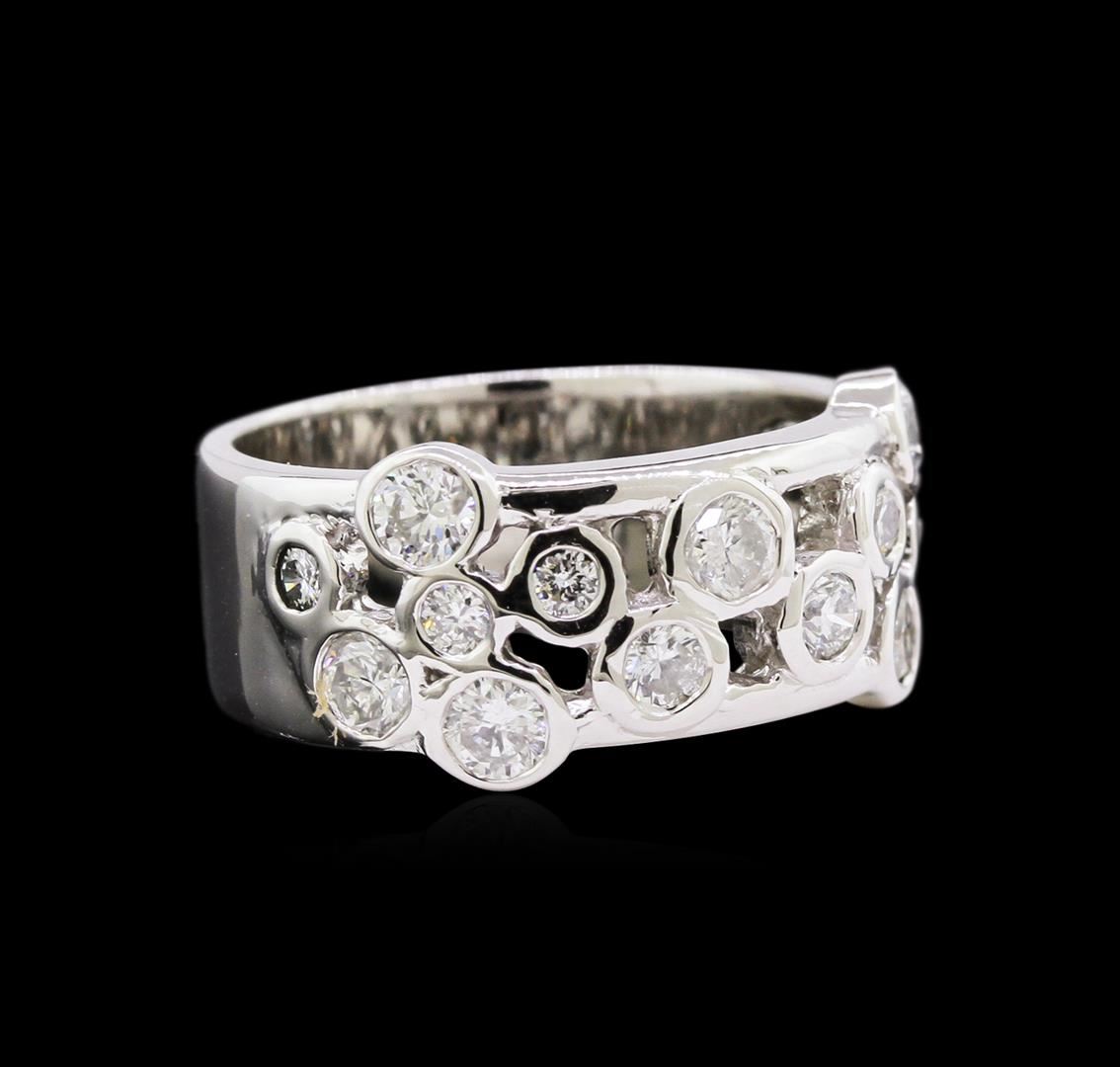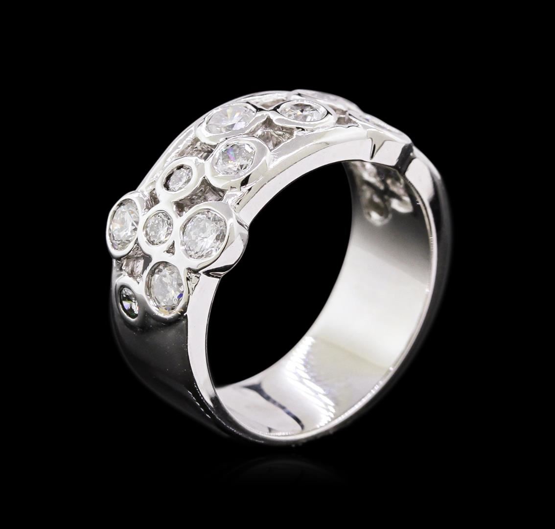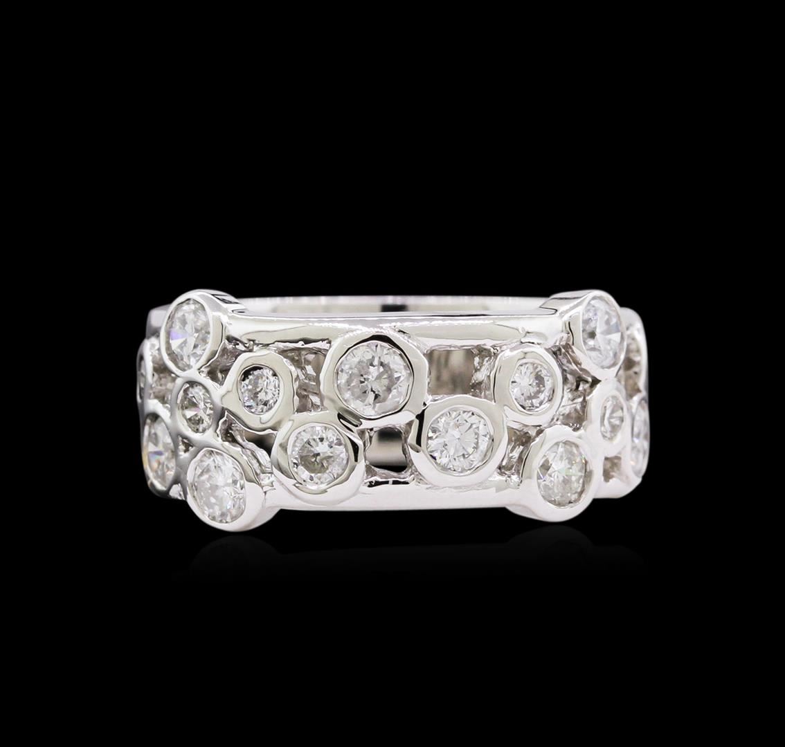 One electronically tested 14KT white gold ladies cast diamond ring with a bright polish finish. The ring features a stylized diamond set curvature, completed by a seven millimeter wide band. Identified with markings of "12K". Condition is new, good workmanship. Containing: Eight bezel set round brilliant cut diamonds, measuring 3.20 - 3.00 x 1.86mm exact total weight 8 Stones = 0.90ct. Graded in the setting. Clarity: SI-2 to I-1. Color: G - I Seven bezel set round brilliant cut diamonds, measuring 2.10 - 2.00 x 1.23mm exact total weight 7 Stones = 0.30ct. Graded in the setting. Clarity: SI-1 to SI-2. Color: G - I. Total Weight of Diamonds 1.20ct. Total Weight of Ring 7.05gm. AIG Appraised at $4,520.00.