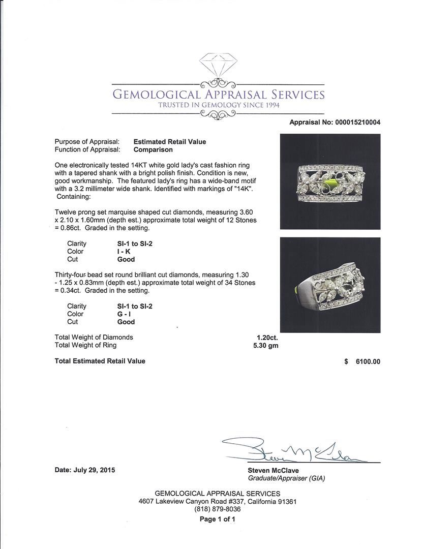 One electronically tested 14KT white gold lady's cast fashion ring with a tapered shank with a bright polish finish. The featured lady's ring has a wide-band motif with a 3.2 millimeter wide shank. Identified with markings of "14K". Condition is new, good workmanship. Containing: Twelve prong set marquise shaped cut diamonds, measuring 3.60 x 2.10 x 1.60mm (depth est.) approximate. Total Weight of 12 Stones = 0.86ct. Graded in the setting. Clarity: SI-1 to SI-2. Color: I - Good Thirty-Four bead set round brilliant cut diamonds, measuring 1.30 - 1.25 x 0.83mm (depth est.) approximate. Total Weight of 34 Stones = 0.34ct. Graded in the setting. Clarity: SI-1 to SI-2. Color: G - I. Cut Good. Total Weight of Diamonds 1.20ct. Total Weight of Ring 5.30gm. GAS Appraised at $6,100.00.