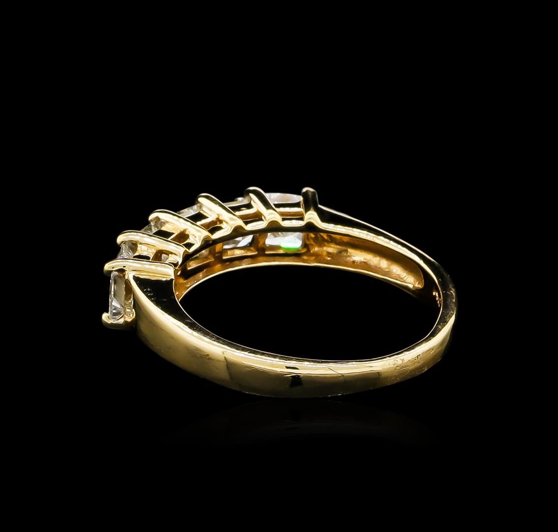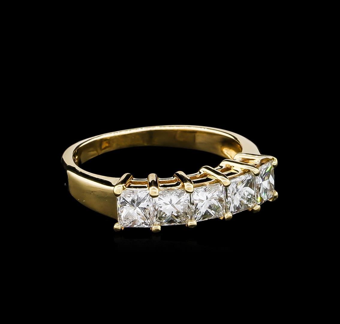 One electronically tested 14KT yellow gold ladies cast diamond ring with a bright polish finish. The ring features a ribbon of princess cut diamonds supported by tapering shoulders, completed by a one and one-half millimeter wide band. Identified with markings of "14K". Condition is good. Containing: Five prong set princess cut diamonds, measuring 3.60 x 3.40 x 2.38mm (depth est.) approximate total weight of 5 Stones = 1.20ct. Graded in the setting. Clarity: VS-1 to SI-1. Color: H - J. Total Weight of Diamonds 1.20ct. Total Weight of Ring 2.94gm. AIG Appraised at $5,315.00.