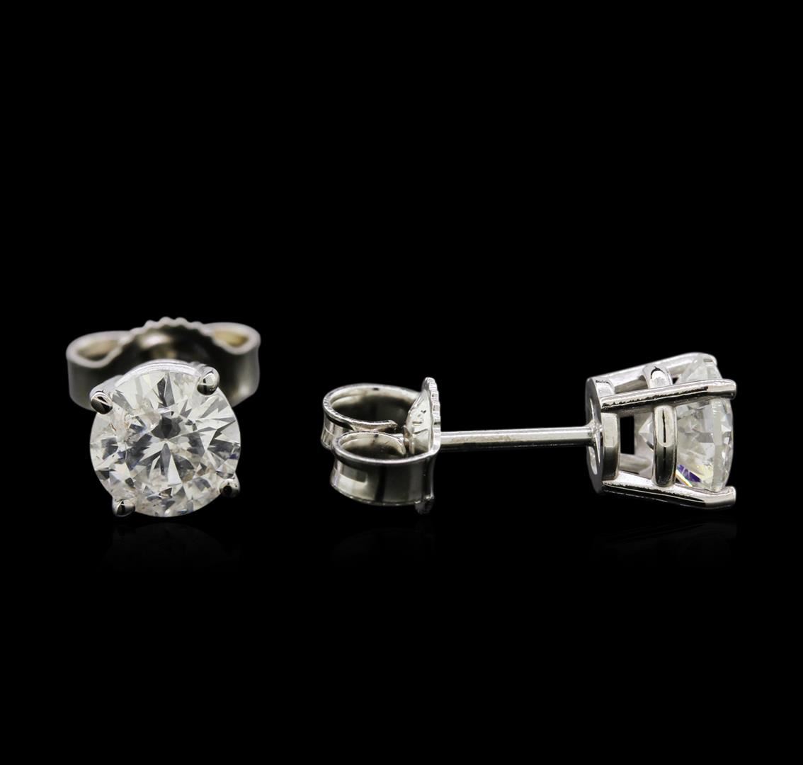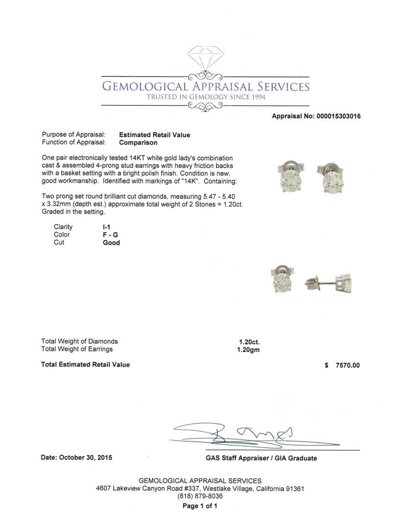 One pair electronically tested 14KT white gold lady's combination cast & assembled 4-prong stud earrings with heavy friction backs with a basket setting with a bright polish finish. Identified with markings of "14K". Condition is new, good workmanship. Containing: Two prong set round brilliant cut diamonds, measuring 5.47 - 5.40 x 3.32mm (depth est.) approximate total weight of 2 Stones = 1.20ct. Graded in the setting. Clarity: I-1. Color: F - Good. Total Weight of Diamonds 1.20ct. Total Weight of Earrings 1.20gm. GAS Appraised.