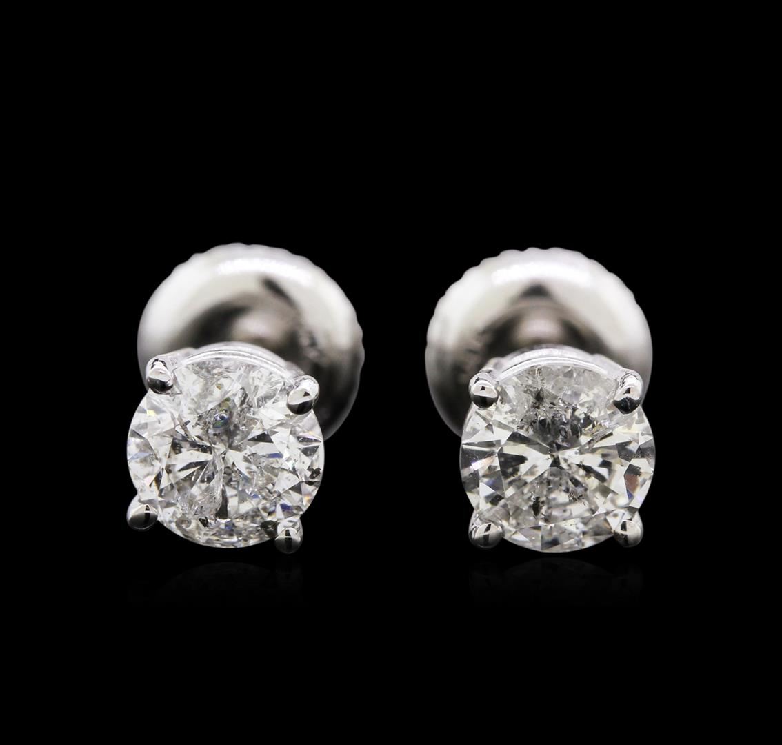 One pair electronically tested 14KT white gold lady's combination cast & assembled stud earrings with threaded posts and screw-on/screw-off backs with a basket setting with a bright polish finish. Identified with markings of "14K". Condition is new, good workmanship. Containing: Two prong set round brilliant cut diamonds, measuring 5.45 - 5.39 x 3.31mm (depth est.) approximate total weight of 2 Stones = 1.20ct. Graded in the setting. Clarity: I-1. Color: H - I. Cut Good. Total Weight of Diamonds 1.20ct. Total Weight of Earrings 1.10gm. GAS Appraised at $6,450.00.