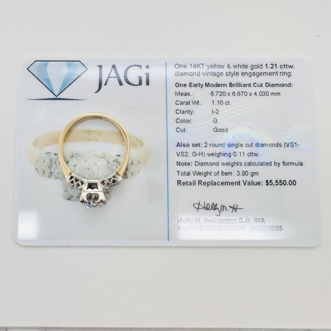 One 14KT yellow and white gold vintage style engagement ring featuring one early modern brilliant cut diamond weighing 1.10 carats, measuring approximately 6.72 x 6.67 x 4.03 mm. The diamond is graded I-2 clarity, G color, and good cut. Also set are two round single cut diamonds (VS1-VS2, G-H) with a total weight of 0.11 carats. The total weight of the ring is 3.90 grams. Diamond weights are calculated by formula and graded in the setting.