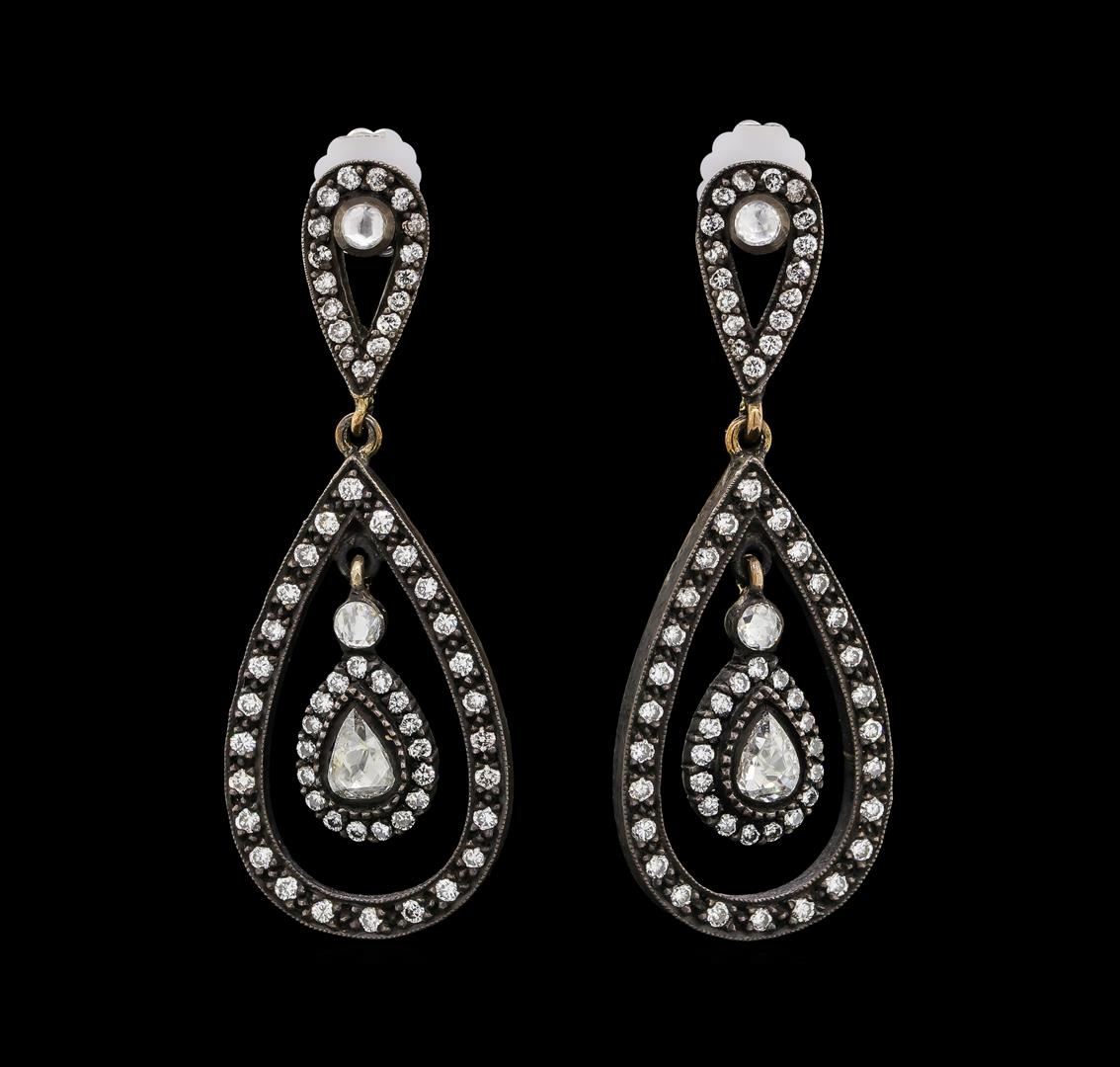 One pair electronically tested 14KT rose with black rhodium gold lady's combination cast & assembled fashion drop earrings with friction posts with a antiqued with milgrain detailing finish. The featured lady's earrings have a drop of approximately 42 millimeters. Identified with markings of '14K'. Condition is new, good workmanship. Containing: Two bezel set rose cut diamonds, measuring 5.40 - 4.00 x 1.40mm (depth est.) approximate total weight of 2 Stones = 0.27ct. Graded in the setting. Clarity SI-2. Color: H - I Cut Fair Four bezel set rose cut diamonds, measuring 2.60 - 2.50 x 1.20mm (depth est.) approximate total weight of 4 Stones = 0.14ct. Graded in the setting. Clarity SI-1 to SI-2. Color: H - I Cut Good Eighty-Six prong set round brilliant cut diamonds, measuring 1.40 - 1.30 x 0.84mm (depth est.) approximate total weight of 86 Stones = 0.80ct. Graded in the setting. Clarity SI-1 to SI-2. Color: G - H Cut Good. Total Weight of Diamonds 1.21ct.. Total Weight of Earrings 9.70gm. GAS Appraised at $4,915.00.