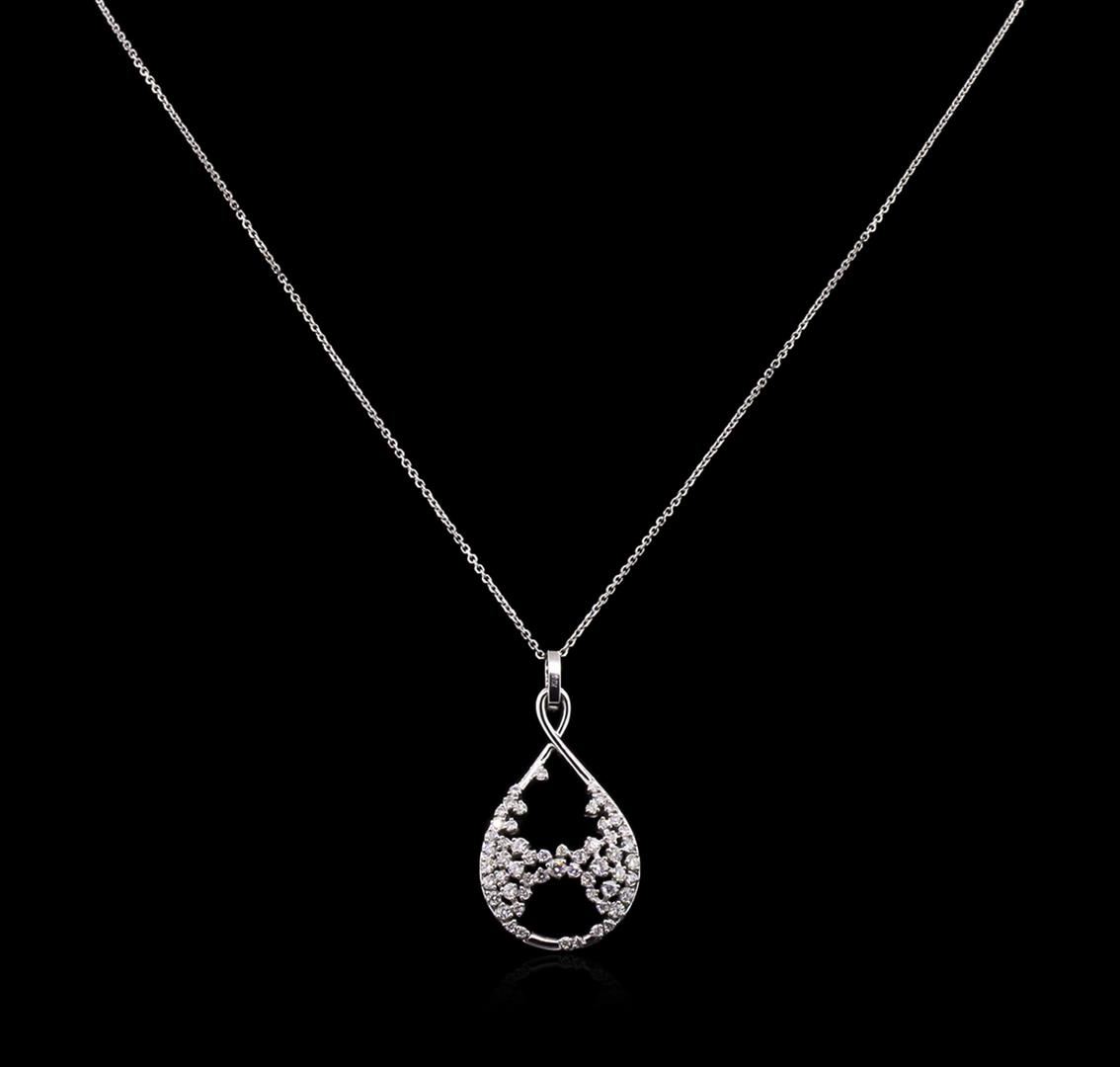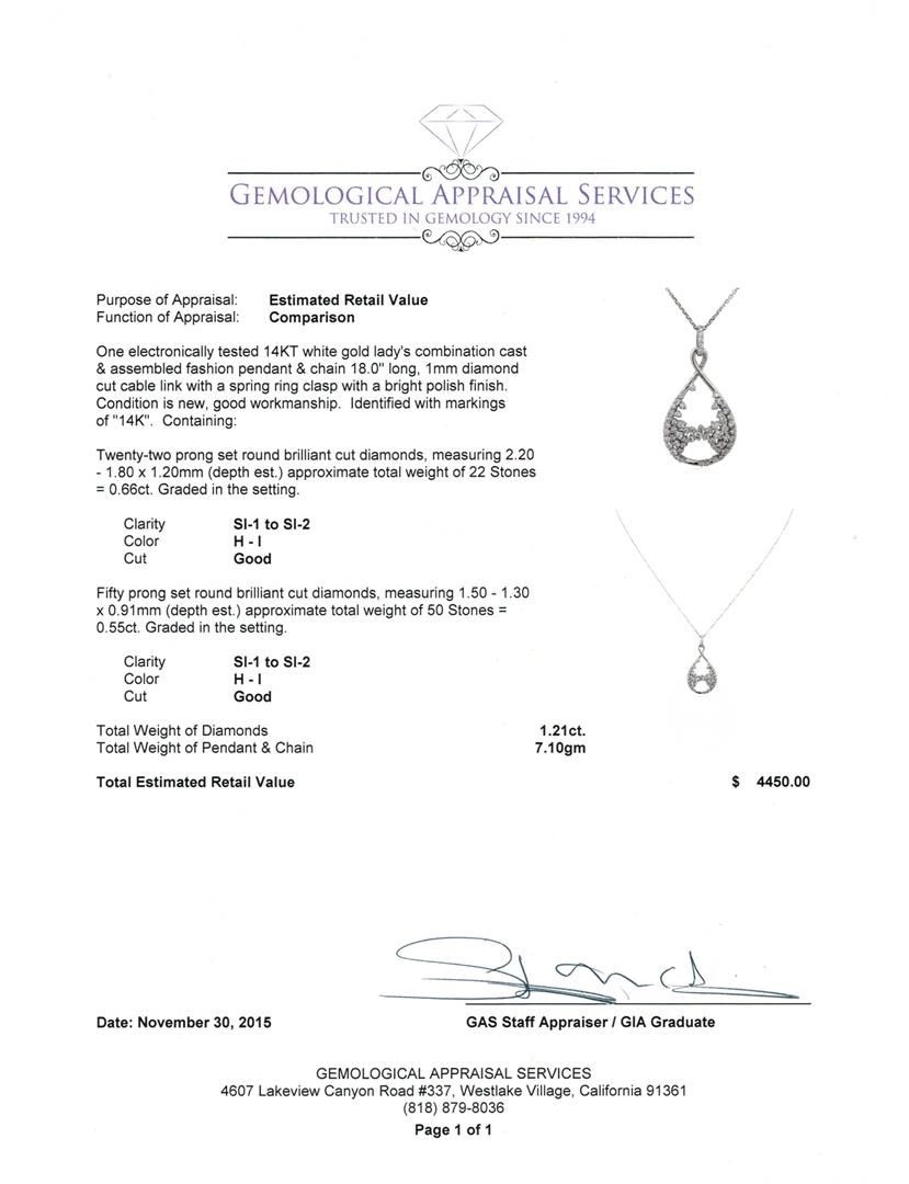 One electronically tested 14KT white gold lady's combination cast & assembled fashion pendant & chain 18.0" long, 1mm diamond cut cable link with a spring ring clasp with a bright polish finish. Identified with markings of "14K". Condition is new, good workmanship. Containing: Twenty-Two prong set round brilliant cut diamonds, measuring 2.20 - 1.80 x 1.20mm (depth est.) approximate total weight of 22 Stones = 0.66ct. Graded in the setting. Clarity: SI-1 to SI-2 . Color: H - I. Cut Good Fifty prong set round brilliant cut diamonds, measuring 1.50 - 1.30 x 0.91mm (depth est.) approximate total weight of 50 Stones = 0.55ct. Graded in the setting. Clarity: SI-1 to SI-2 . Color: H - I. Cut Good. Total Weight of Diamonds 1.21ct.. Total Weight of Pendant & Chain 7.10gm at $ 4450.00 GAS Appraised.