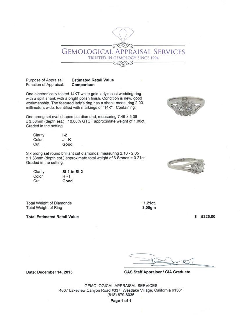 One electronically tested 14KT white gold lady's cast wedding ring with a split shank with a bright polish finish. The featured lady's ring has a shank measuring 2.00 millimeters wide. Identified with markings of "14K". Condition is new, good workmanship. Containing: One prong set oval shaped cut diamond, measuring 7.49 x 5.38 x 3.58mm (depth est.) , 10.00.%. GTCF approximate weight of 1.00ct. Graded in the setting. Clarity: I-2. Color: J - Good Six prong set round brilliant cut diamonds, measuring 2.10 - 2.05 x 1.33mm (depth est.) approximate total weight of 6 Stones = 0.21ct. Graded in the setting. Clarity: SI-1 to SI-2. Color: H - I. Cut Good. Total Weight of Diamonds 1.21ct. Total Weight of Ring 3.00gm. GAS Appraised at $5,225.00.