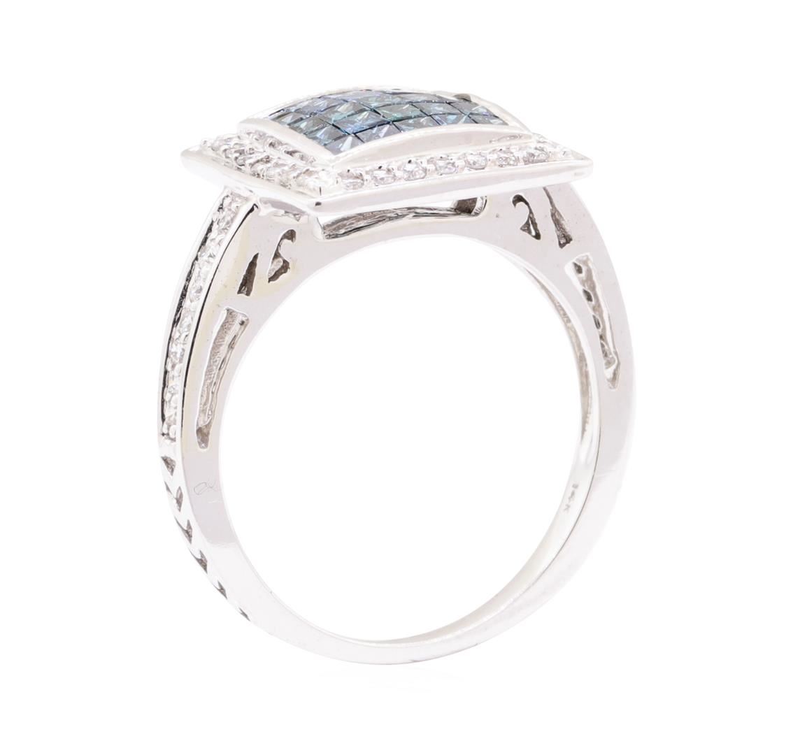 One electronically tested 14KT white gold lady's combination cast & assembled fashion ring with a square halo with a bright polish finish. The featured lady's ring has a shank measuring 1.70 millimeter siwde. Identified with markings of '14K'. Condition is new, good workmanship. Containing: Twenty-Five invisible set princess cut treated diamonds, measuring 1.80 x 1.70 x 1.28mm (depth est.) approximate total weight of 25 Stones = 0.83ct. Colored gemstones are presumed to have been subjected to commonly used enhancement processes. Graded in the setting. Color Fancy Dark Greenish Blue Clarity SI-2 to I-1 Cut Good Forty-Two prong set round brilliant cut diamonds, measuring 1.40 - 1.30 x 0.81mm (depth est.) approximate total weight of 42 Stones = 0.38ct. Graded in the setting. Color F - G Clarity SI-2 to I-1 Cut Good. Total Weight of Diamonds 1.21ct.. Total Weight of Ring 4.60gm GAS Appraised at $2910.00. GAS Appraised.