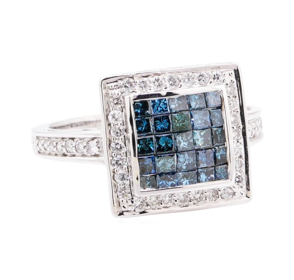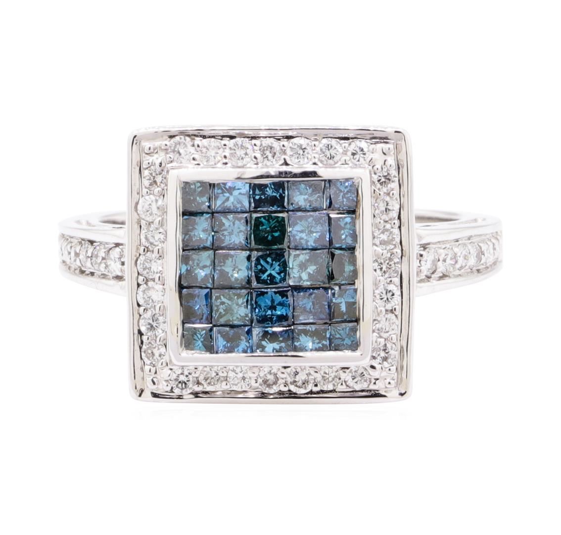 One electronically tested 14KT white gold lady's combination cast & assembled fashion ring with a square halo with a bright polish finish. The featured lady's ring has a shank measuring 1.70 millimeter siwde. Identified with markings of '14K'. Condition is new, good workmanship. Containing: Twenty-Five invisible set princess cut treated diamonds, measuring 1.80 x 1.70 x 1.28mm (depth est.) approximate total weight of 25 Stones = 0.83ct. Colored gemstones are presumed to have been subjected to commonly used enhancement processes. Graded in the setting. Color Fancy Dark Greenish Blue Clarity SI-2 to I-1 Cut Good Forty-Two prong set round brilliant cut diamonds, measuring 1.40 - 1.30 x 0.81mm (depth est.) approximate total weight of 42 Stones = 0.38ct. Graded in the setting. Color F - G Clarity SI-2 to I-1 Cut Good. Total Weight of Diamonds 1.21ct.. Total Weight of Ring 4.60gm GAS Appraised at $2910.00. GAS Appraised.