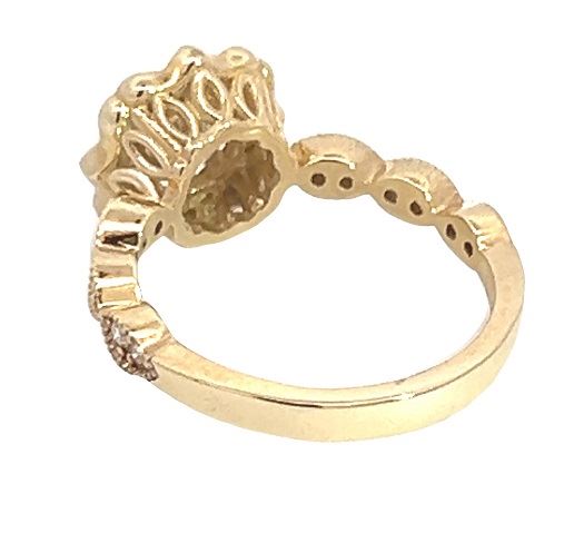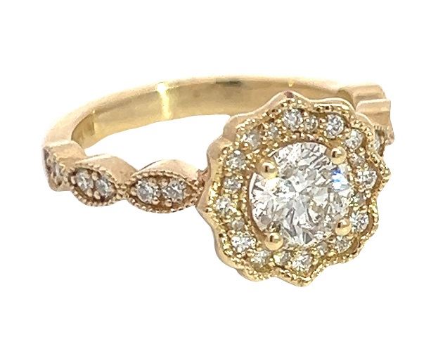 One electronically tested 14KT yellow gold lady's custom CAD/CAM wedding ring with a scalloped basket halo with a bright polish with migraine detailing finish. The featured lady's ring has a ribbon motif shank measuring 2.50 millimeters wide. Trademark is MJ. Identified with markings of "14K". Condition is new, good workmanship. Containing: One prong set round brilliant cut diamond, measuring 5.97 - 5.93 x 3.73mm (depth est.) approximate weight of 0.82ct. Graded loose prior to setting in the GIA Laboratory, Report #2215086227. Laser inscribed on girdle. Color K Clarity I-2 Cut Very Good Twelve prong set round brilliant cut diamonds, measuring 1.80 - 1.70 x 1.09mm (depth est.) approximate total weight of 12 Stones = 0.25ct. Graded in the setting. Color G - H Clarity VS-2 to SI-1 Cut Very Good Twenty prong set round brilliant cut diamonds, measuring 1.30 - 1.10 x 0.74mm (depth est.) approximate total weight of 20 Stones = 0.14ct. Graded in the setting. Color G - H Clarity VS-2 to SI-1 Cut Very Good Total Weight of Diamonds 1.21ct. Total Weight of Ring 4.20gm Estimated Retail Value $ 9500.00