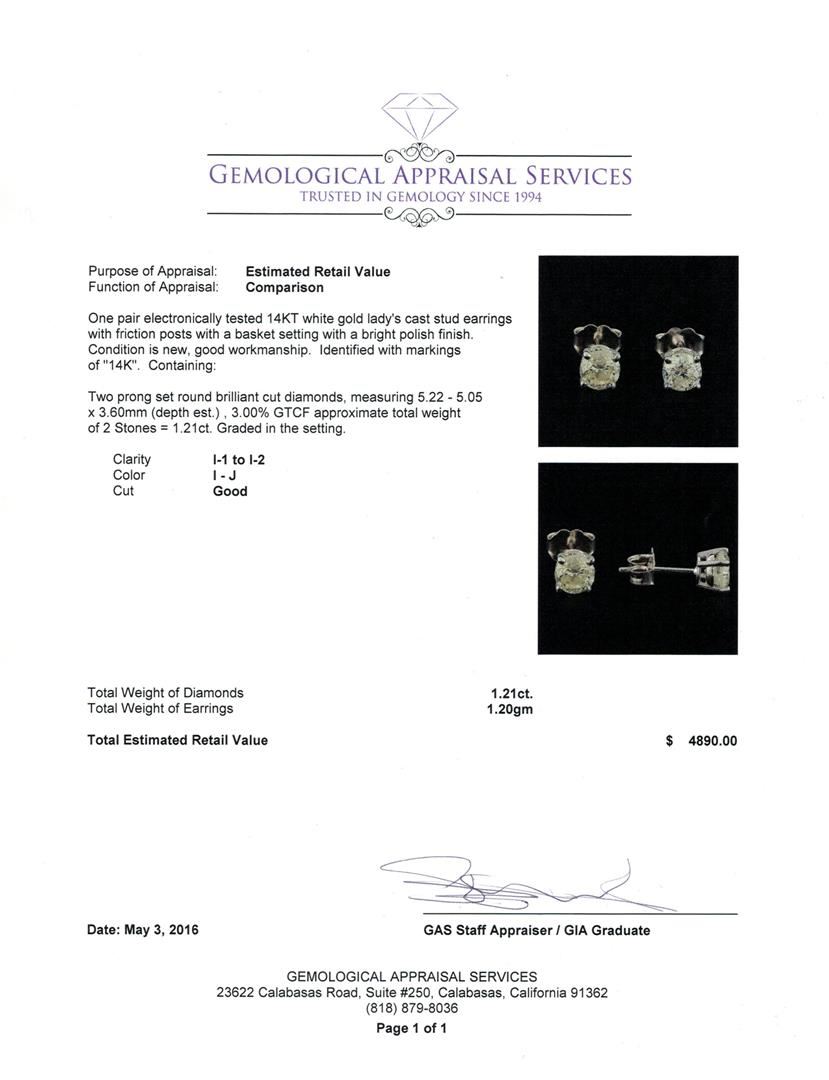 One pair electronically tested 14KT white gold lady's cast stud earrings with friction posts with a basket setting with a bright polish finish. Identified with markings of "14K". Condition is new, good workmanship. Containing: Two prong set round brilliant cut diamonds, measuring 5.22 - 5.05 x 3.60mm (depth est.) , 3.00.%. GTCF approximate total weight of 2 Stones = 1.21ct. Graded in the setting. Clarity: I-1 to I-2. Color: I - Good. Total Weight of Diamonds 1.21ct. Total Weight of Earrings 1.20gm GAS Appraised at $4,890.00.