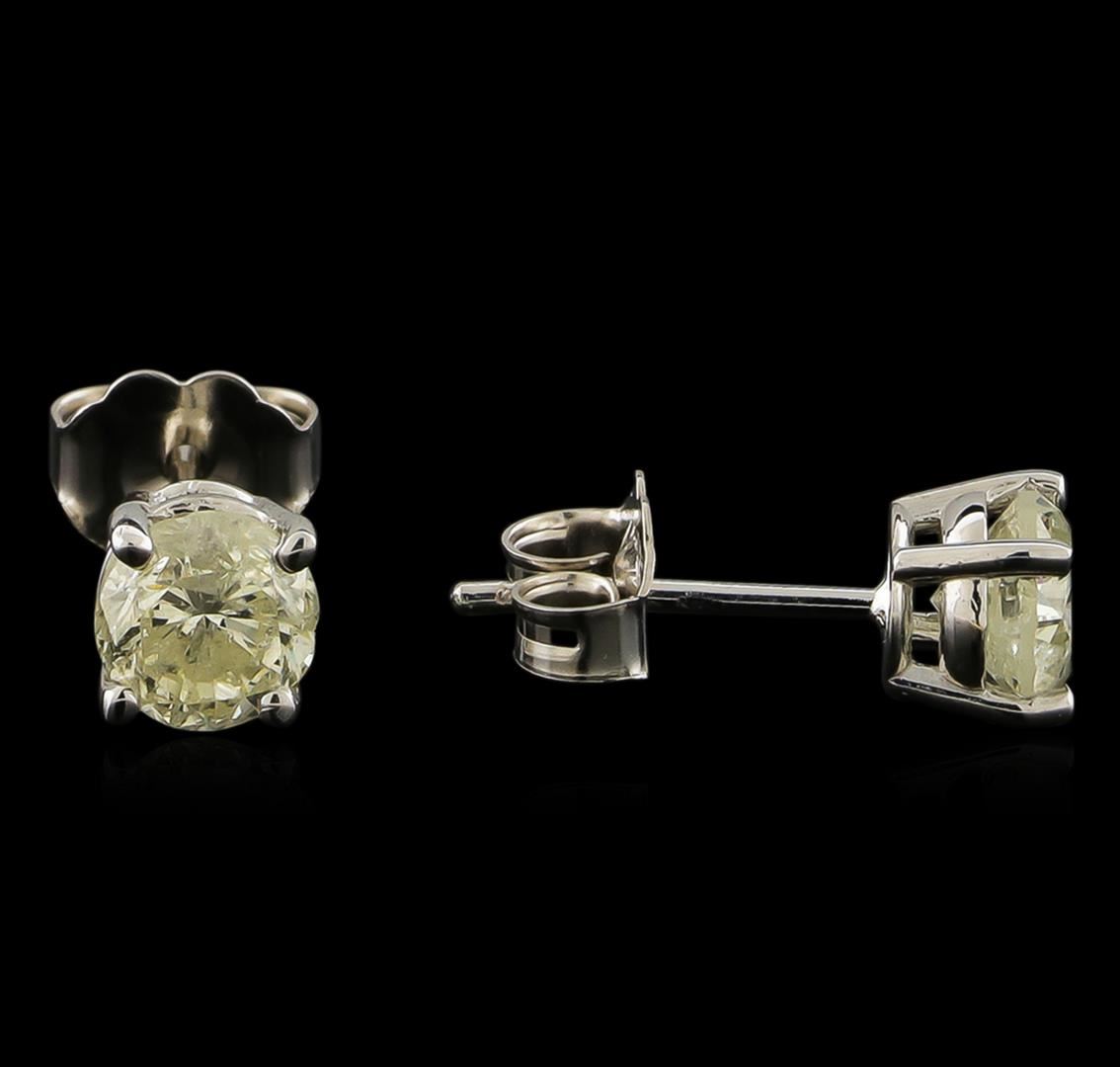 One pair electronically tested 14KT white gold lady's cast stud earrings with friction posts with a basket setting with a bright polish finish. Identified with markings of "14K". Condition is new, good workmanship. Containing: Two prong set round brilliant cut diamonds, measuring 5.22 - 5.05 x 3.60mm (depth est.) , 3.00.%. GTCF approximate total weight of 2 Stones = 1.21ct. Graded in the setting. Clarity: I-1 to I-2. Color: I - Good. Total Weight of Diamonds 1.21ct. Total Weight of Earrings 1.20gm GAS Appraised at $4,890.00.