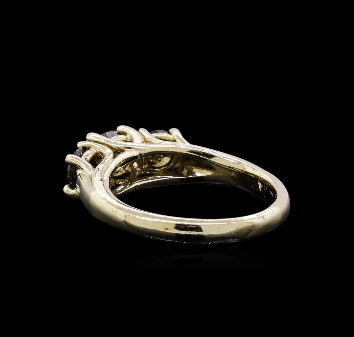 One electronically tested 14KT yellow gold lady's cast 3-stone ring with a tapered shank with a bright polish finish. The featured lady's ring has a shank measuring 2.75 millimeters wide. Identified with markings of "14K". Condition is new, good workmanship. Containing: One prong set round brilliant cut diamond, measuring 4.90 - 4.87 x 2.90mm (depth est.) approximate weight of 0.45ct. Colored gemstones are presumed to have been subjected to commonly used enhancement processes. Graded in the setting. Clarity: I-1 Cut Good Two prong set round brilliant cut diamonds, measuring 4.66 - 4.60 x 2.90mm (depth est.) approximate total weight of 2 Stones = 0.76ct. Colored gemstones are presumed to have been subjected to commonly used enhancement processes. Graded in the setting. Clarity: I-1 Cut Very Good. Total Weight of Diamonds 1.21ct. Total Weight of Ring 5.00gm. GAS Appraised at $5,415.00.