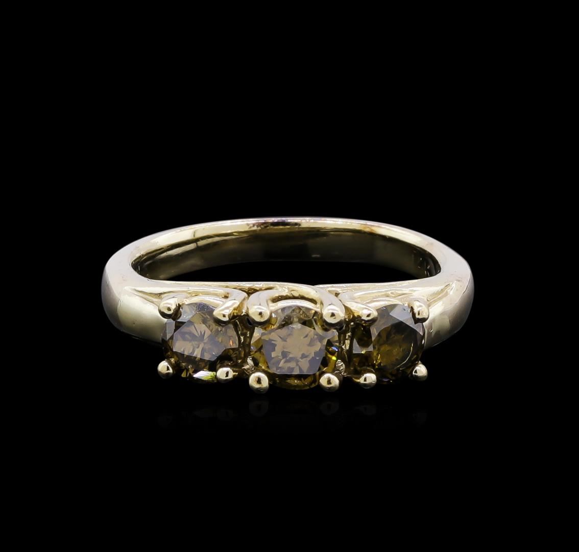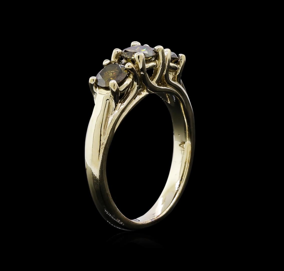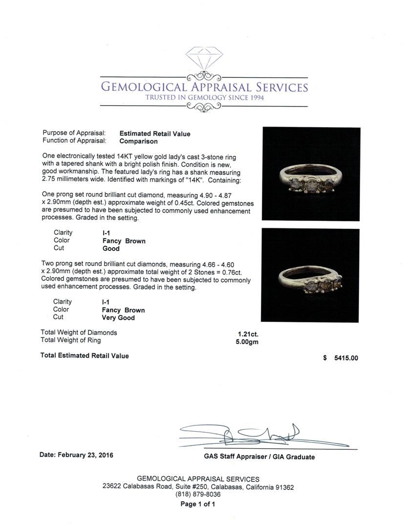 One electronically tested 14KT yellow gold lady's cast 3-stone ring with a tapered shank with a bright polish finish. The featured lady's ring has a shank measuring 2.75 millimeters wide. Identified with markings of "14K". Condition is new, good workmanship. Containing: One prong set round brilliant cut diamond, measuring 4.90 - 4.87 x 2.90mm (depth est.) approximate weight of 0.45ct. Colored gemstones are presumed to have been subjected to commonly used enhancement processes. Graded in the setting. Clarity: I-1 Cut Good Two prong set round brilliant cut diamonds, measuring 4.66 - 4.60 x 2.90mm (depth est.) approximate total weight of 2 Stones = 0.76ct. Colored gemstones are presumed to have been subjected to commonly used enhancement processes. Graded in the setting. Clarity: I-1 Cut Very Good. Total Weight of Diamonds 1.21ct. Total Weight of Ring 5.00gm. GAS Appraised at $5,415.00.