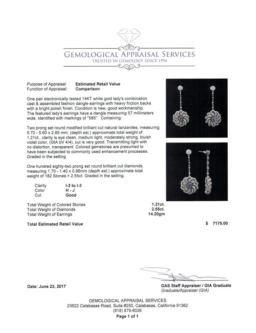 One pair electronically tested 14KT white gold lady's combination cast & assembled fashion dangle earrings with heavy friction backs with a bright polish finish. The featured lady's earrings have a dangle measuring 57 millimeters wide. Identified with markings of '585'. Condition is new, good workmanship. Containing: Two prong set round modified brilliant cut natural tanzanites, measuring 5.70 - 5.60 x 2.85 mm, (depth est.) approximate total weight of 1.21ct., clarity is eye clean, medium light, moderately strong, bluish violet color, (GIA bV 4/4), cut is very good. Transmitting light with no distortion, transparent. Colored gemstones are presumed to have been subjected to commonly used enhancement processes. Graded in the setting. One Hundred Eighty-Two prong set round brilliant cut diamonds, measuring 1.70 - 1.40 x 0.96mm (depth est.) approximate total weight of 182 Stones = 2.55ct. Graded in the setting. Color H - J Clarity I-2 to I-3 Cut Good. Total Weight of Colored Stones 1.21ct.. Total Weight of Diamonds 2.55ct.. Total Weight of Earrings 14.20gm GAS Appraised at $7175.00. GAS Appraised at $7,175.00.