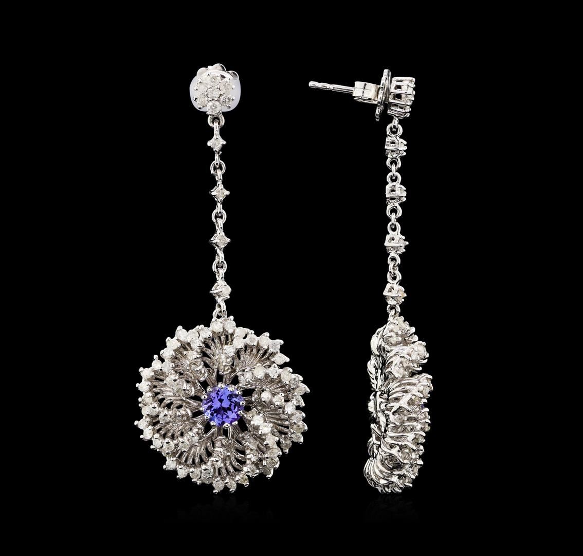 One pair electronically tested 14KT white gold lady's combination cast & assembled fashion dangle earrings with heavy friction backs with a bright polish finish. The featured lady's earrings have a dangle measuring 57 millimeters wide. Identified with markings of '585'. Condition is new, good workmanship. Containing: Two prong set round modified brilliant cut natural tanzanites, measuring 5.70 - 5.60 x 2.85 mm, (depth est.) approximate total weight of 1.21ct., clarity is eye clean, medium light, moderately strong, bluish violet color, (GIA bV 4/4), cut is very good. Transmitting light with no distortion, transparent. Colored gemstones are presumed to have been subjected to commonly used enhancement processes. Graded in the setting. One Hundred Eighty-Two prong set round brilliant cut diamonds, measuring 1.70 - 1.40 x 0.96mm (depth est.) approximate total weight of 182 Stones = 2.55ct. Graded in the setting. Color H - J Clarity I-2 to I-3 Cut Good. Total Weight of Colored Stones 1.21ct.. Total Weight of Diamonds 2.55ct.. Total Weight of Earrings 14.20gm GAS Appraised at $7175.00. GAS Appraised at $7,175.00.