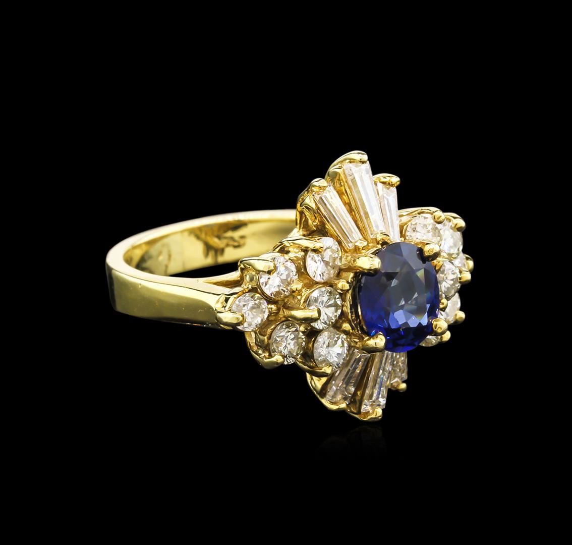 One electronically tested 14KT yellow gold lady's cast fashion ring with a basket setting with a bright polish finish. The featured lady's ring has a shank measuring 3.45 millimeters wide. Identified with markings of "14K". Condition is new, good workmanship. Containing: One prong set oval modified brilliant cut natural blue sapphire, measuring 7.20 x 6.55 x 3.60mm, approximate weight of 1.21ct., clarity is eye clean, type II, medium, moderately strong, blue color, (GIA B 5/4), cut is good. Transmitting light with no distortion, transparent. Colored gemstones are presumed to have been subjected to commonly used enhancement processes. Graded in the setting. Two prong set baguette cut (tapered) diamonds, measuring 5.30 x 2.00 x 1.70mm (depth est.) approximate total weight of 2 Stones = 0.26ct. Graded in the setting. Clarity: SI-1 to SI-2. Color: G - Good Four prong set baguette cut (tapered) diamonds, measuring from 3.90 x 1.20 x 1.02mm (depth est.) to 4.00 x 1.60 x 1.37mm (depth est.) approximate total weight of 4 Stones = 0.28ct. Graded in the setting. Clarity: SI-1 to SI-2. Color: H - I. Cut Good Twelve prong set round brilliant cut diamonds, measuring 2.80 - 2.70 x 1.79mm (depth est.) approximate total weight of 12 Stones = 1.00ct. Graded in the setting. Clarity: SI-1 to I-1. Color: I - Good. Total Weight of Colored Stones 1.21ct. Total Weight of Diamonds 1.54ct. Total Weight of Ring 6.80gm. GAS Appraised at $5,675.00.