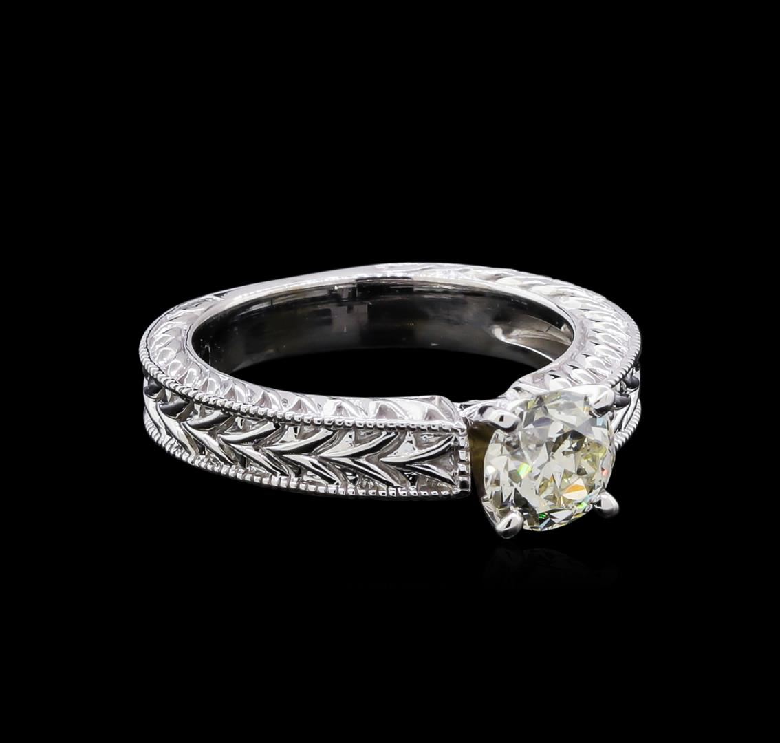 One electronically tested 14KT white gold ladies cast & assembled diamond solitaire ring. The featured diamond is supported by elaborate patterned shoulders, completed by a three millimeter wide band. Bright polish finish with milgrain detailing throughout. Condition is good. Containing: One prong set Old European cut diamond, measuring 6.59 - 6.30 x 4.40mm (depth est.) approximate weight of 1.21ct. Graded in the setting. Clarity: I-1. Color: K. Depth 68.2%. Table 54.3%. Total Weight of Diamonds 1.21ct. Total Weight of Ring 6.54gm. AIG Appraised at $8,145.00.
