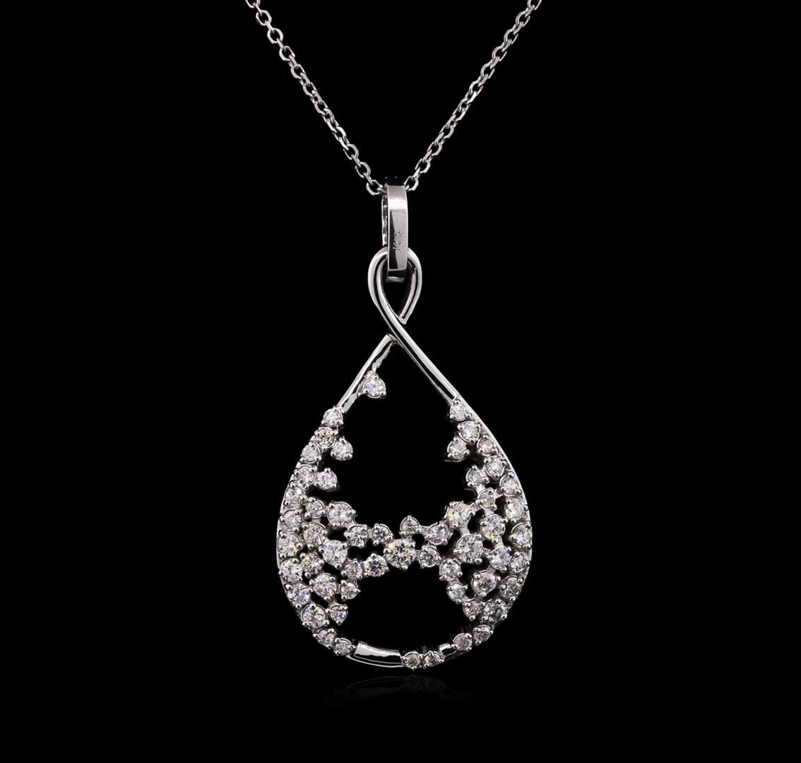 One electronically tested 14KT white gold lady's combination cast & assembled fashion pendant & chain 18.0" long, 1mm diamond cut cable link with a spring ring clasp with a bright polish finish. Identified with markings of "14K". Condition is new, good workmanship. Containing: Twenty-Two prong set round brilliant cut diamonds, measuring 2.20 - 1.80 x 1.20mm (depth est.) approximate total weight of 22 Stones = 0.66ct. Graded in the setting. Clarity: SI-1 to SI-2 . Color: H - I. Cut Good Fifty prong set round brilliant cut diamonds, measuring 1.50 - 1.30 x 0.91mm (depth est.) approximate total weight of 50 Stones = 0.55ct. Graded in the setting. Clarity: SI-1 to SI-2 . Color: H - I. Cut Good. Total Weight of Diamonds 1.21ct.. Total Weight of Pendant & Chain 7.10gm at $ 4450.00 GAS Appraised.