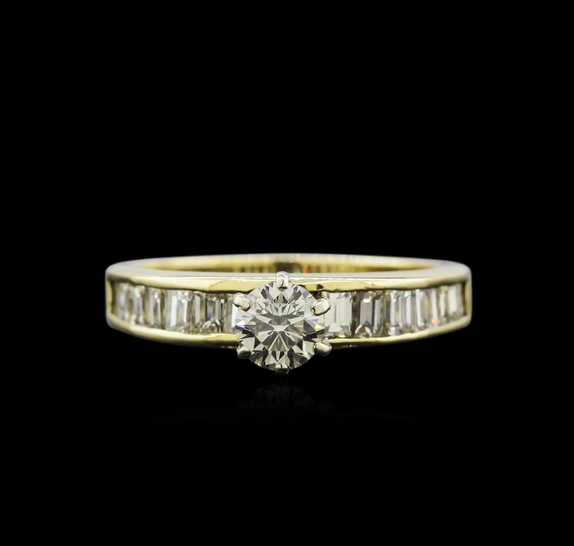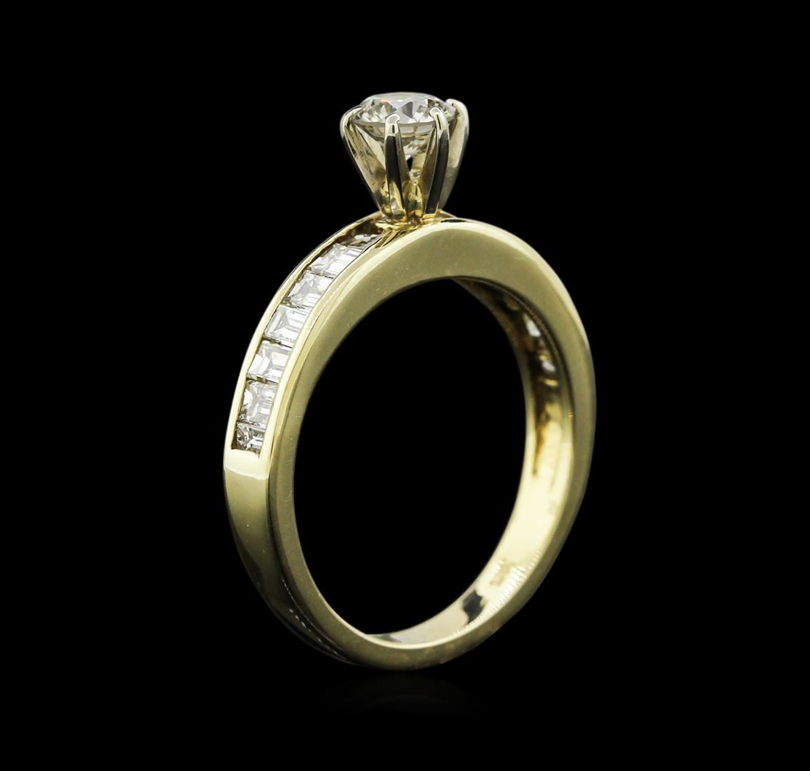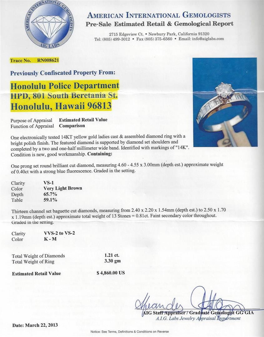 One electronically tested yellow gold ladies cast & assembled diamond ring with a bright polish finish. Condition is new, good workmanship. The featured diamond is supported by diamond set shoulders and completed by a two and one-half millimeter wide band. Identified with markings of1114K". Containing: One prong set round brilliant cut diamond, measuring 4.60 - 4.55 x 3.00mm (depth est.) approximate weight of0.40ct with a strong blue fluorescence. Graded in the setting. Thirteen channel set baguette cut diamonds, measuring from 2.40 x 2.20 x 1.54mm (depth est.) to 2.50 x 1.70x 1.19mm (depth est.) approximate total weight of 13 Stones = 0.8let. Faint secondary color throughout. Graded in the setting. AIG Appraised at $4,860.00.