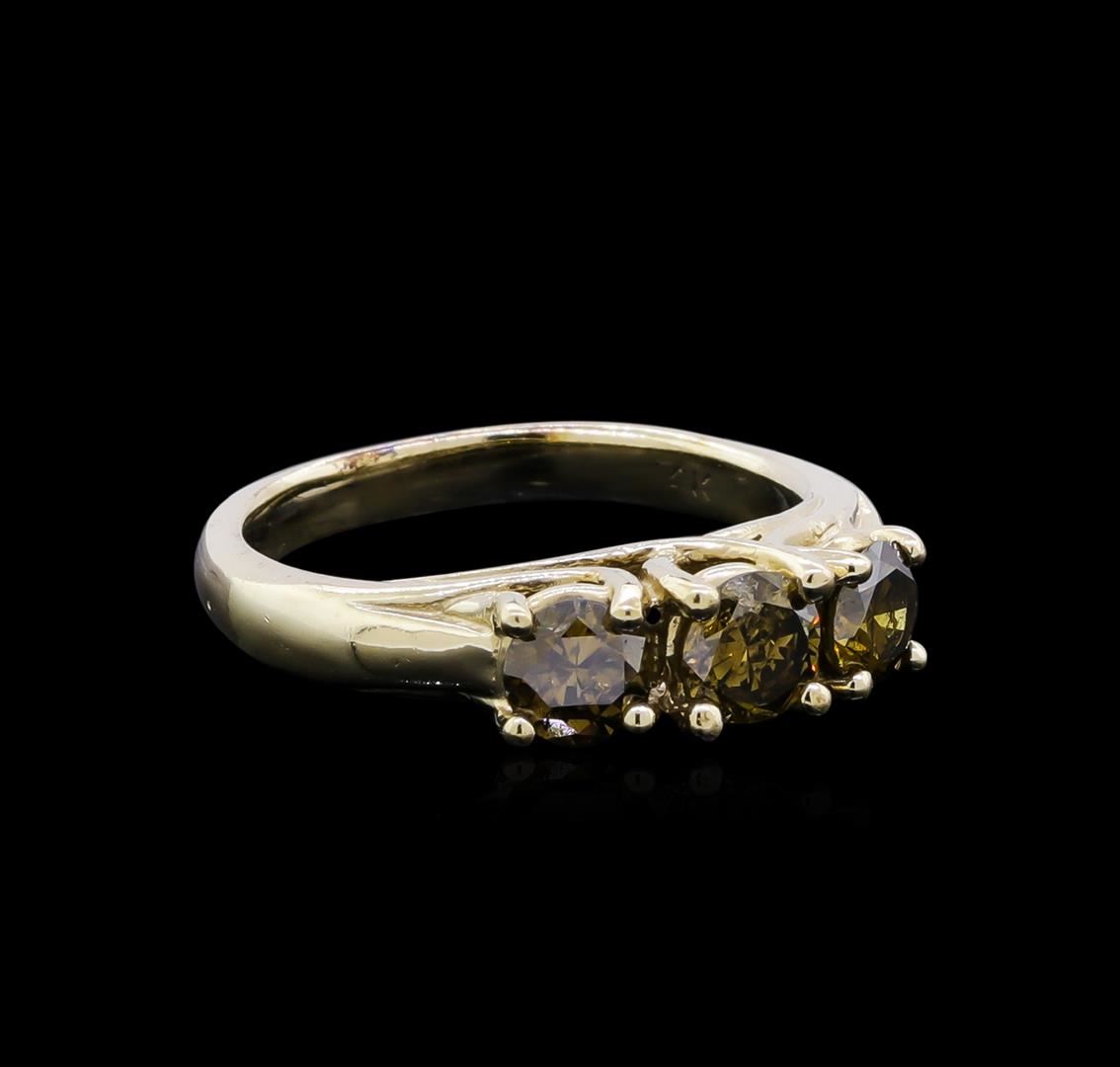 One electronically tested 14KT yellow gold lady's cast 3-stone ring with a tapered shank with a bright polish finish. The featured lady's ring has a shank measuring 2.75 millimeters wide. Identified with markings of "14K". Condition is new, good workmanship. Containing: One prong set round brilliant cut diamond, measuring 4.90 - 4.87 x 2.90mm (depth est.) approximate weight of 0.45ct. Colored gemstones are presumed to have been subjected to commonly used enhancement processes. Graded in the setting. Clarity: I-1 Cut Good Two prong set round brilliant cut diamonds, measuring 4.66 - 4.60 x 2.90mm (depth est.) approximate total weight of 2 Stones = 0.76ct. Colored gemstones are presumed to have been subjected to commonly used enhancement processes. Graded in the setting. Clarity: I-1 Cut Very Good. Total Weight of Diamonds 1.21ct. Total Weight of Ring 5.00gm. GAS Appraised at $5,415.00.