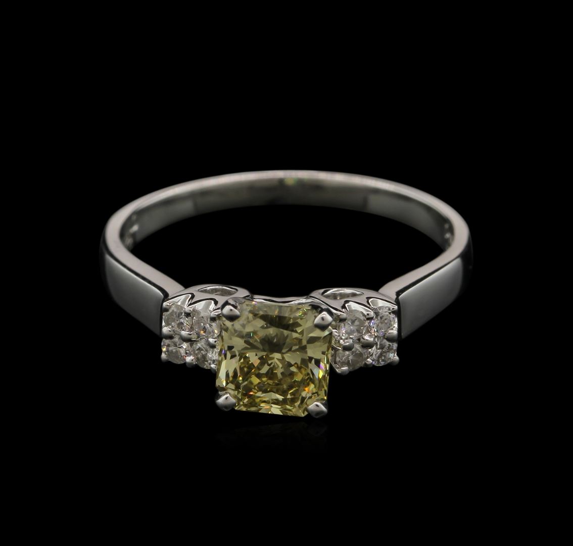 One electronically tested 14KT white gold ladies cast diamond engagement ring with a bright polish finish. Identified with markings of "14K". Condition is new. Containing: One prong set radiant shaped cut diamond, measuring 5.70 x 5.70 x 4.28mm (depth est.) approximate weight of 1.01ct. Clarity: VS-1, Cut is Good. Eight prong set round brilliant cut diamonds, measuring 2.00 - 2.00 x 1.20mm (depth est.) approximate total weight of 8 Stones = 0.20ct. Clarity: SI-1 to SI-2. Color: H - I, Cut is Good. Diamonds are graded in the mounting, unless otherwise stated. Total Weight of Diamonds 1.21ct. Total Weight of Engagement Ring 2.50 grams. GGL Appraised at $7,600.00.