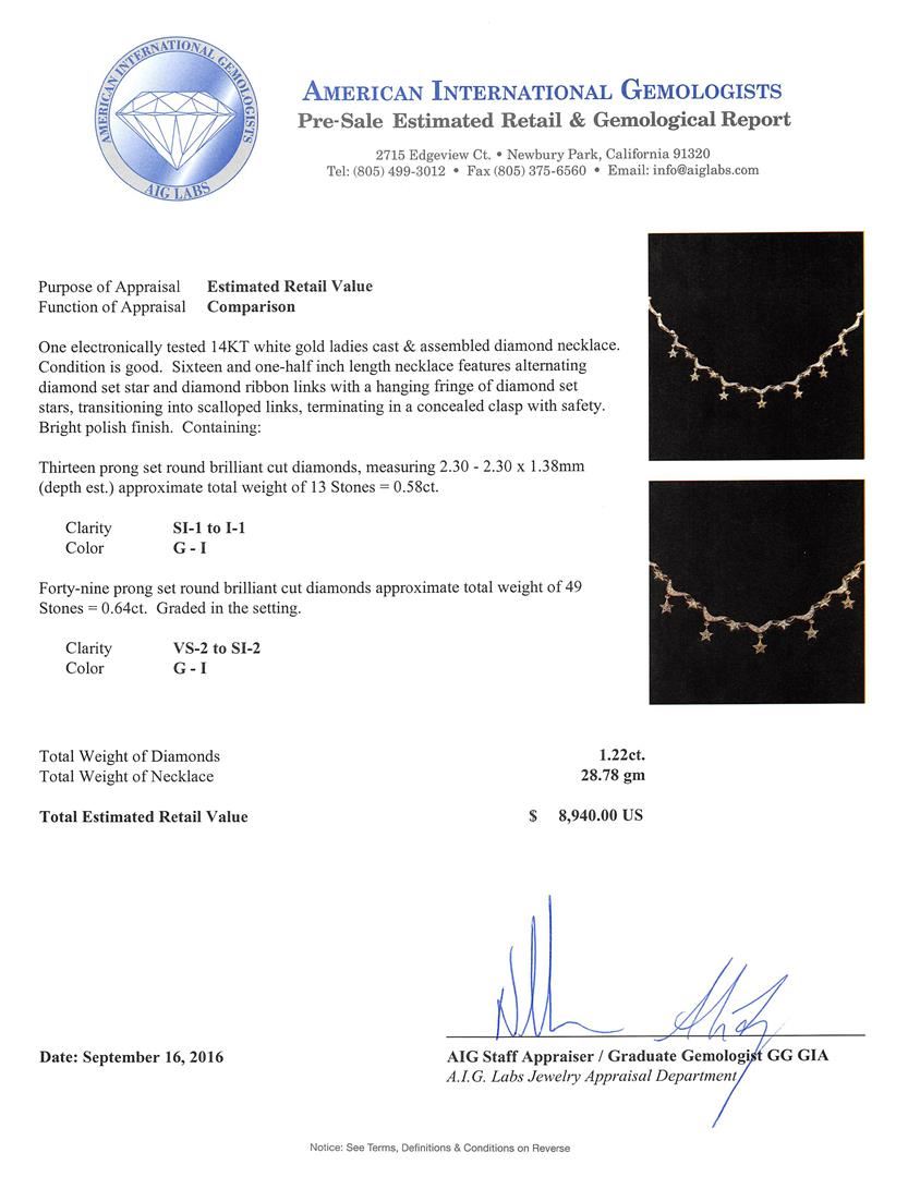 One electronically tested 14KT white gold ladies cast & assembled diamond necklace. Sixteen and one-half inch length necklace features alternating diamond set star and diamond ribbon links with a hanging fringe of diamond set stars, transitioning into scalloped links, terminating in a concealed clasp with safety. Bright polish finish. Condition is good. Containing: Thirteen prong set round brilliant cut diamonds, measuring 2.30 - 2.30 x 1.38mm (depth est.) approximate total weight of 13 Stones = 0.58ct. Clarity SI-1 to I-1. Color: G - I Forty-Nine prong set round brilliant cut diamonds approximate total weight of 49 Stones = 0.64ct. Graded in the setting. Clarity VS-2 to SI-2. Color: G - I. Total Weight of Diamonds 1.22ct.. Total Weight of Necklace 28.78gm. AIG Appraised at $8,940.00.