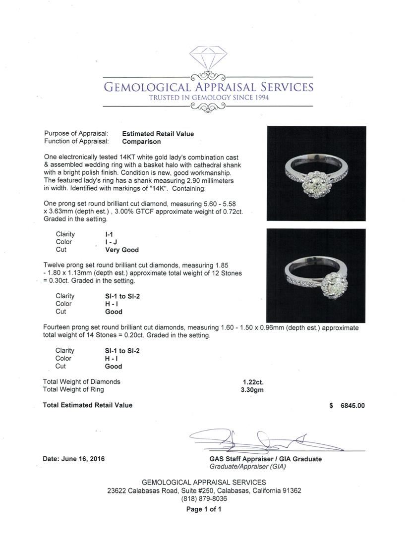 One electronically tested 14KT white gold lady's combination cast & assembled wedding ring with a basket halo with cathedral shank with a bright polish finish. The featured lady's ring has a shank measuring 2.90 millimeters in width. Identified with markings of "14K". Condition is new, good workmanship. Containing: One prong set round brilliant cut diamond, measuring 5.60 - 5.58 x 3.63mm (depth est.) , 3.00.%. GTCF approximate weight of 0.72ct. Graded in the setting. Clarity: I-1. Color: I - Very Good Twelve prong set round brilliant cut diamonds, measuring 1.85 - 1.80 x 1.13mm (depth est.) approximate total weight of 12 Stones = 0.30ct. Graded in the setting. Clarity: SI-1 to SI-2. Color: H - I. Cut Good Fourteen prong set round brilliant cut diamonds, measuring 1.60 - 1.50 x 0.96mm (depth est.) approximate total weight of 14 Stones = 0.20ct. Graded in the setting. Clarity: SI-1 to SI-2. Color: H - I. Cut Good. Total Weight of Diamonds 1.22ct. Total Weight of Ring 3.30gm GAS Appraised at $6,845.00.