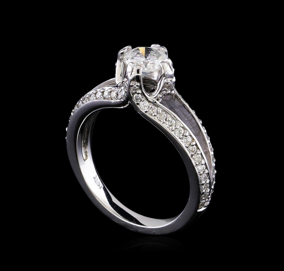 One electronically tested 14KT white gold lady's cast wedding ring with a cathedral split shank with a bright polish finish. The featured lady's ring has a shank measuring 2.75 millimeters in width. Identified with markings of "14K". Condition is new, good workmanship. Containing: One prong set round brilliant cut diamond, measuring 5.72 - 5.70 x 3.34mm (depth est.) approximate weight of 0.70ct. Graded in the setting. Clarity: SI-3. Color: Good Sixty-Eight prong set round brilliant cut diamonds, measuring 1.30 - 1.20 x 0.78mm (depth est.) approximate total weight of 68 Stones = 0.52ct. Graded in the setting. Clarity: SI-1 to SI-2. Color: H - I. Cut Good. Total Weight of Diamonds 1.22ct. Total Weight of Ring 5.30gm. GAS Appraised at $7,020.00.