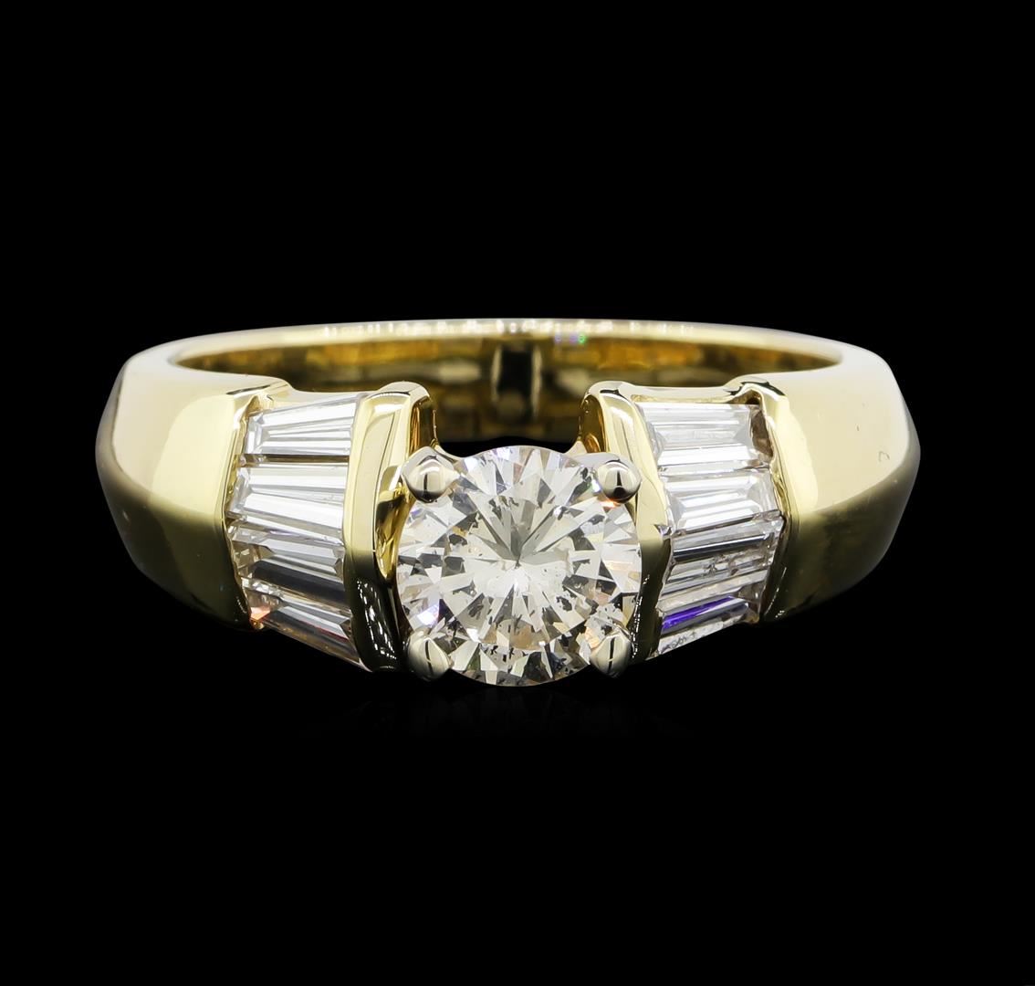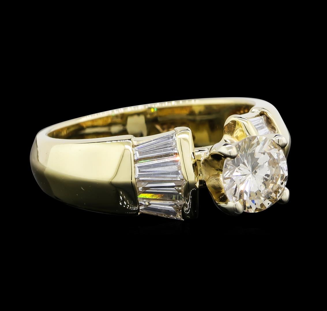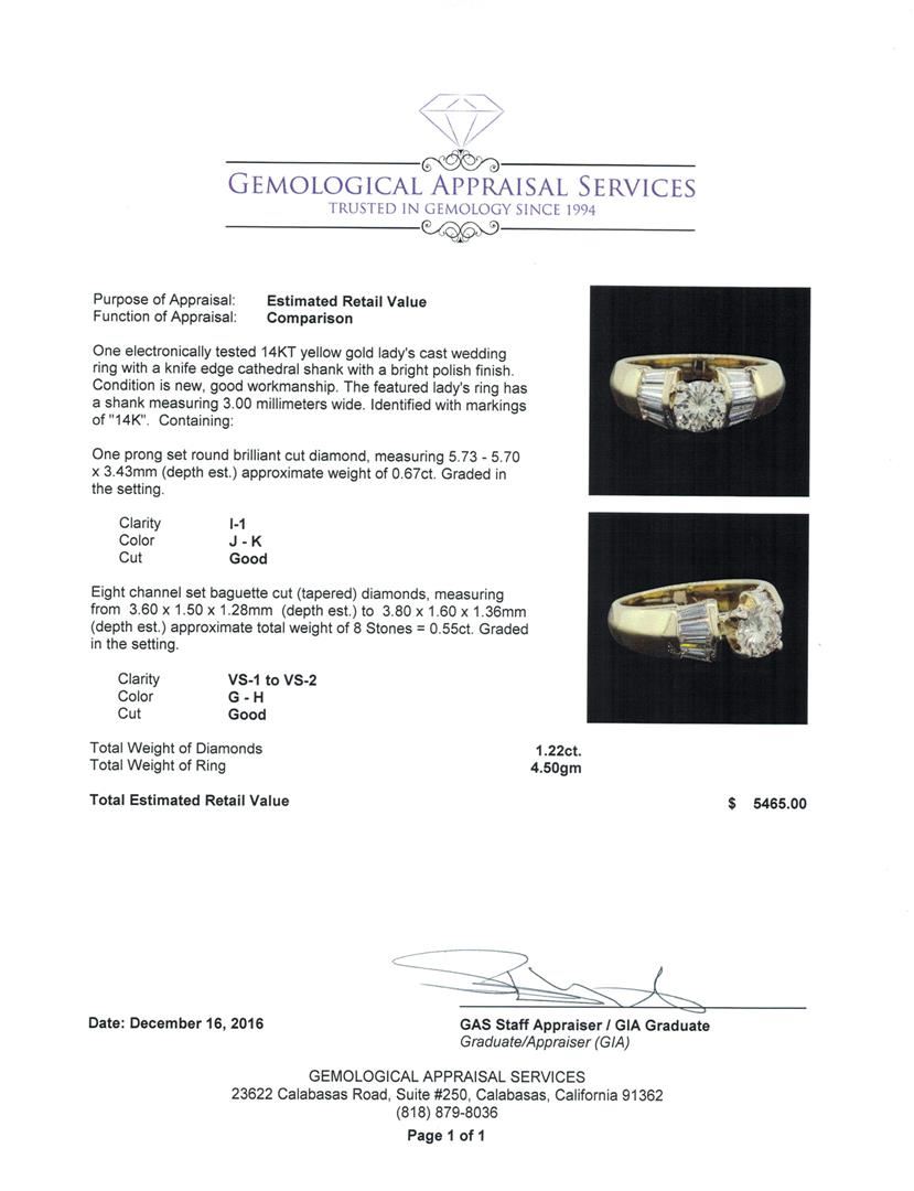 One electronically tested 14KT yellow gold lady's cast wedding ring with a knife edge cathedral shank with a bright polish finish. The featured lady's ring has a shank measuring 3.00 millimeters wide. Identified with markings of '14K'. Condition is new, good workmanship. Containing: One prong set round brilliant cut diamond, measuring 5.73 - 5.70 x 3.43mm (depth est.) approximate weight of 0.67ct. Graded in the setting. Clarity I-1. Color: J - K Cut Good Eight channel set baguette cut (tapered) diamonds, measuring from 3.60 x 1.50 x 1.28mm (depth est.) to 3.80 x 1.60 x 1.36mm (depth est.) approximate total weight of 8 Stones = 0.55ct. Graded in the setting. Clarity VS-1 to VS-2. Color: G - H Cut Good. Total Weight of Diamonds 1.22ct.. Total Weight of Ring 4.50gm. GAS Appraised at $5,465.00.
