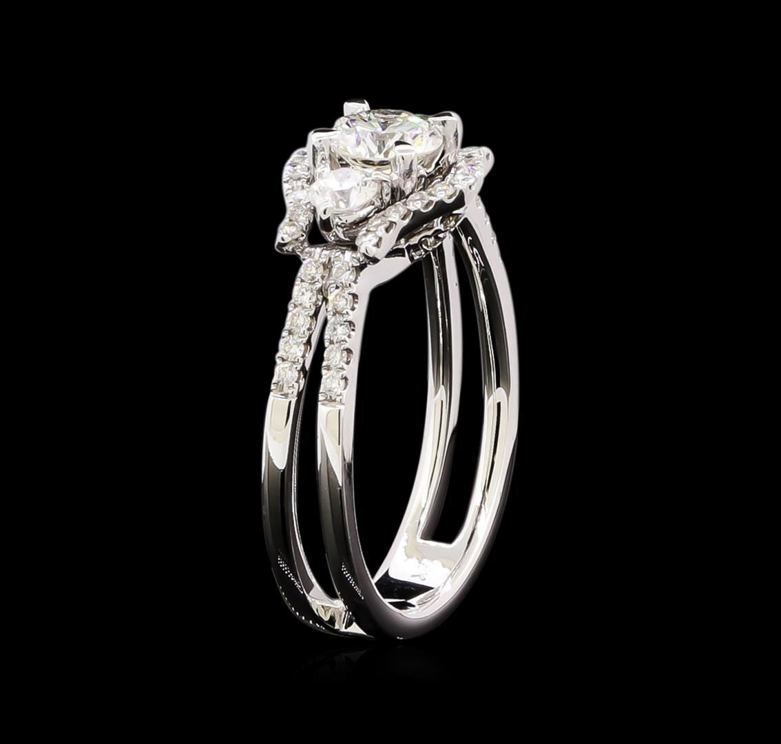 One electronically tested 18KT white gold ladies cast diamond unity ring with a bright polish finish. The featured diamond is center set between a smaller diamond on each side within framing diamond ribbons supported by a diamond set under gallery and diamond set split shoulders, completed by a four millimeter wide band. Identified with markings of "18K". Condition is new, good workmanship. Containing: One prong set round brilliant cut diamond, measuring 5.50 - 5.50 x 3.30mm (depth est.) approximate weight of 0.61ct. Graded in the setting. Clarity: SI-3. Color: 60.0%. Table 58.2%. Two prong set round brilliant cut diamonds, measuring 3.20 - 3.10 x 1.89mm (depth est.) approximate total weight of 2 Stones = 0.25ct. Graded in the setting. Clarity: SI-1 to SI-2. Color: F - G Forty-Two prong set round brilliant cut diamonds, measuring 1.20 - 1.20 x 0.72mm (depth est.) approximate total weight of 42 Stones = 0.36ct. Graded in the setting. Clarity: SI-1 to I-1. Color: G - I. Total Weight of Diamonds 1.22ct. Total Weight of Ring 5.72gm. AIG Appraised at $6,680.00.