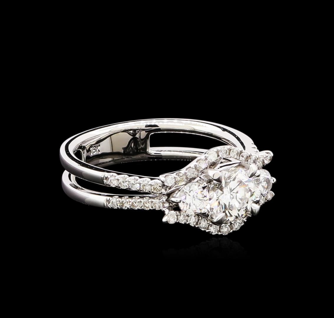 One electronically tested 18KT white gold ladies cast diamond unity ring with a bright polish finish. The featured diamond is center set between a smaller diamond on each side within framing diamond ribbons supported by a diamond set under gallery and diamond set split shoulders, completed by a four millimeter wide band. Identified with markings of "18K". Condition is new, good workmanship. Containing: One prong set round brilliant cut diamond, measuring 5.50 - 5.50 x 3.30mm (depth est.) approximate weight of 0.61ct. Graded in the setting. Clarity: SI-3. Color: 60.0%. Table 58.2%. Two prong set round brilliant cut diamonds, measuring 3.20 - 3.10 x 1.89mm (depth est.) approximate total weight of 2 Stones = 0.25ct. Graded in the setting. Clarity: SI-1 to SI-2. Color: F - G Forty-Two prong set round brilliant cut diamonds, measuring 1.20 - 1.20 x 0.72mm (depth est.) approximate total weight of 42 Stones = 0.36ct. Graded in the setting. Clarity: SI-1 to I-1. Color: G - I. Total Weight of Diamonds 1.22ct. Total Weight of Ring 5.72gm. AIG Appraised at $6,680.00.