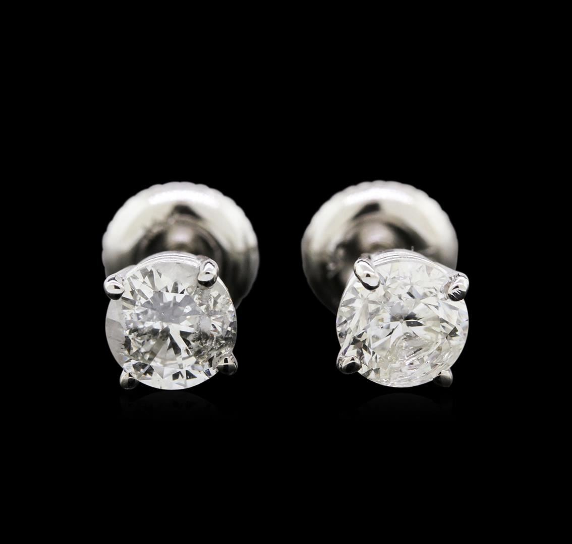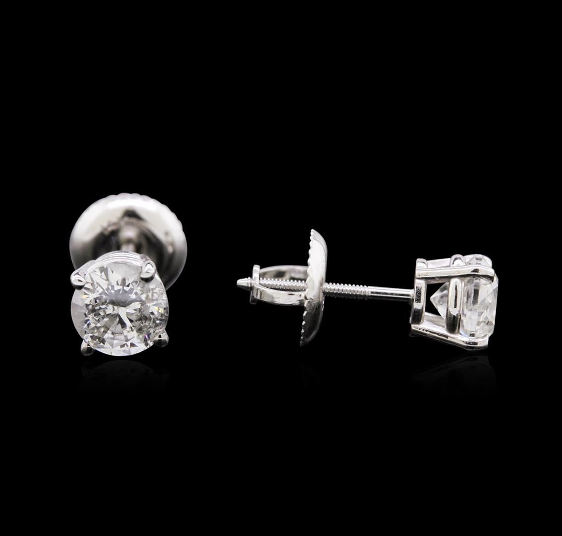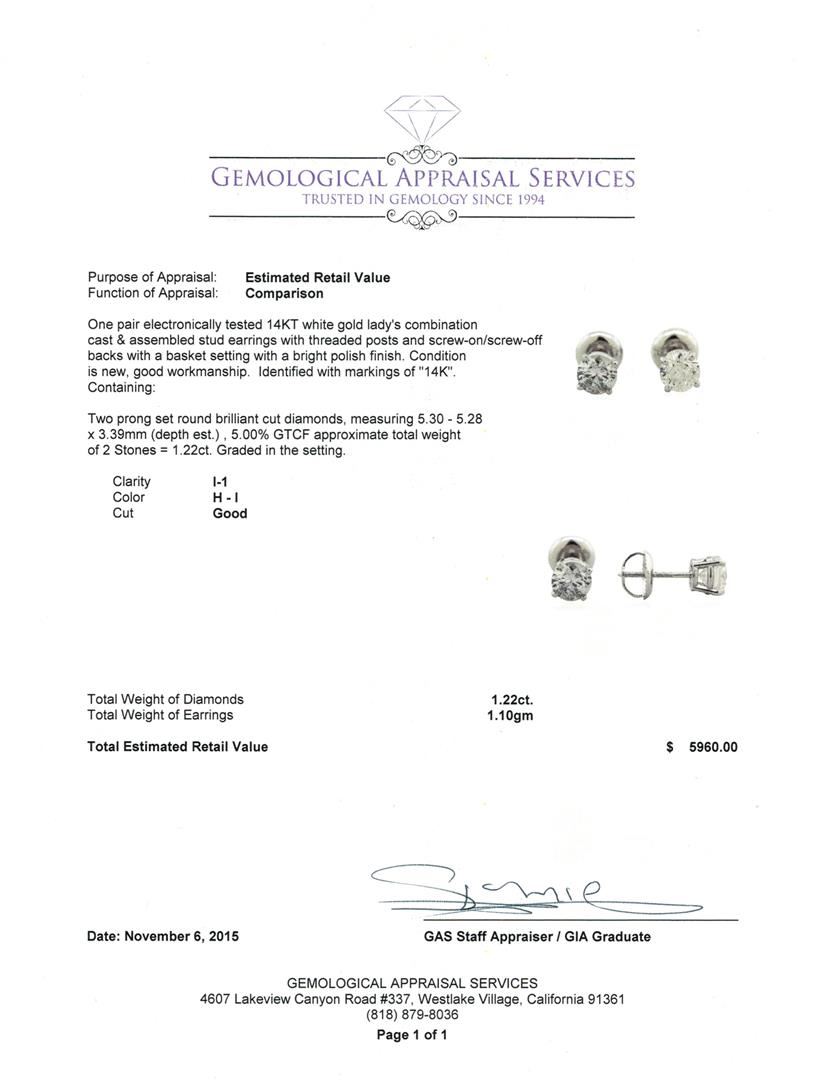 One pair electronically tested 14KT white gold lady's combination cast & assembled stud earrings with threaded posts and screw-on/screw-off backs with a basket setting with a bright polish finish. Identified with markings of "14K". Condition is new, good workmanship. Containing: Two prong set round brilliant cut diamonds, measuring 5.30 - 5.28 x 3.39mm (depth est.) , 5.00% GTCF approximate total weight of 2 Stones = 1.22ct. Graded in the setting. Clarity: I-1. Color: H - I. Cut Good. Total Weight of Diamonds 1.22ct. Total Weight of Earrings 1.10gm. GAS Appraised at $5,960.00.
