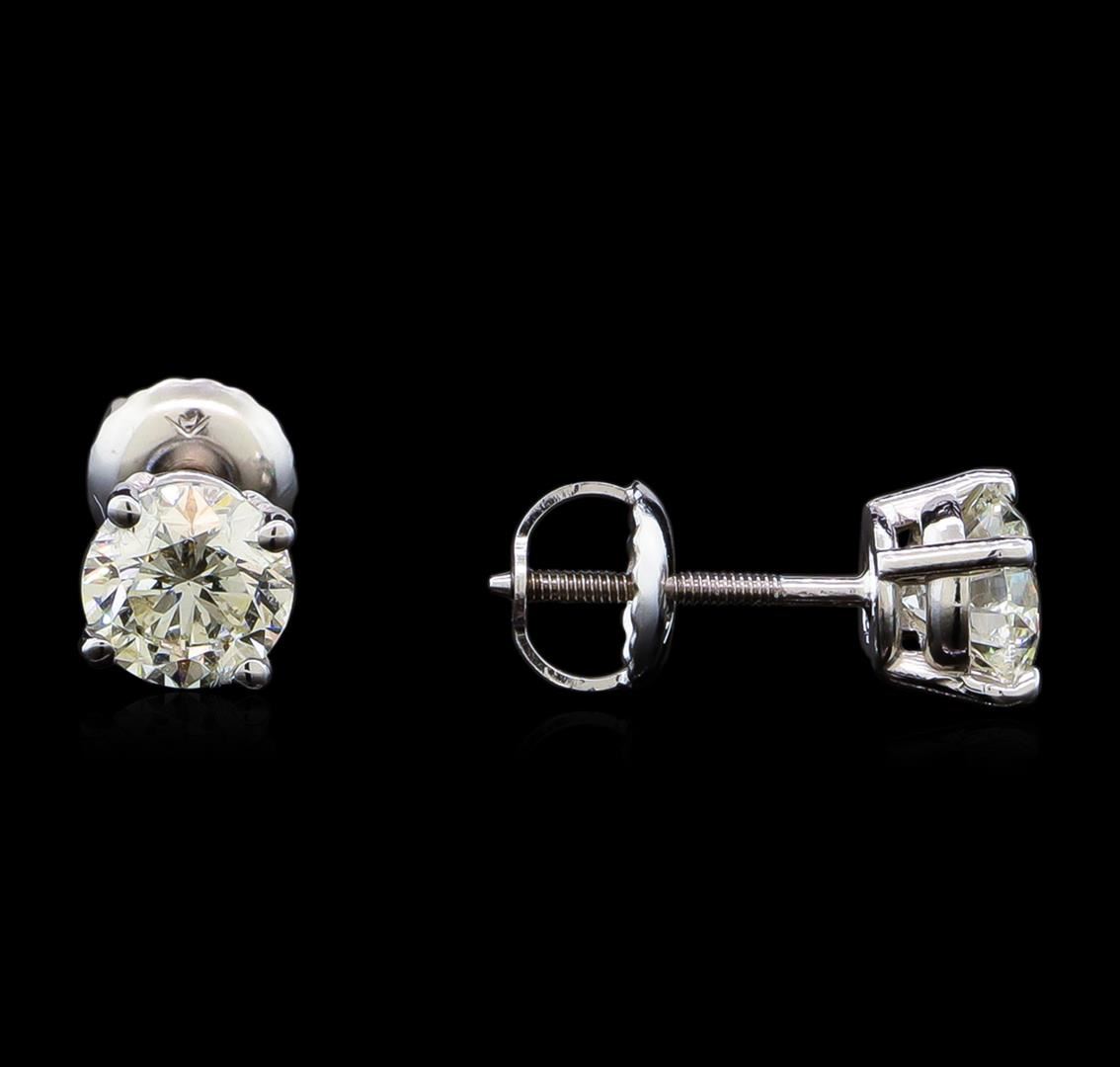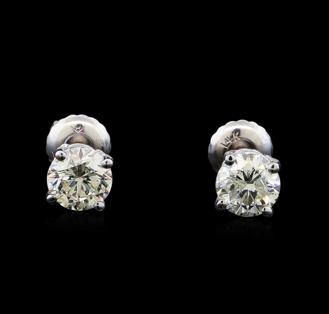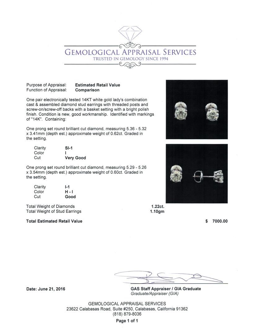 One pair electronically tested 14KT white gold lady's combination cast & assembled diamond stud earrings with threaded posts and screw-on/screw-off backs with a basket setting with a bright polish finish. Identified with markings of "14K". Condition is new, good workmanship. Containing: One prong set round brilliant cut diamond, measuring 5.36 - 5.32 x 3.41mm (depth est.) approximate weight of 0.62ct. Graded in the setting. Clarity: SI-1. Color: I. Cut Very Good One prong set round brilliant cut diamond, measuring 5.29 - 5.26 x 3.54mm (depth est.) approximate weight of 0.60ct. Graded in the setting. Clarity: I-1. Color: H - I. Cut Good. Total Weight of Diamonds 1.22ct. Total Weight of Stud Earrings 1.10gm. GAS Appraised at $7,000.00.
