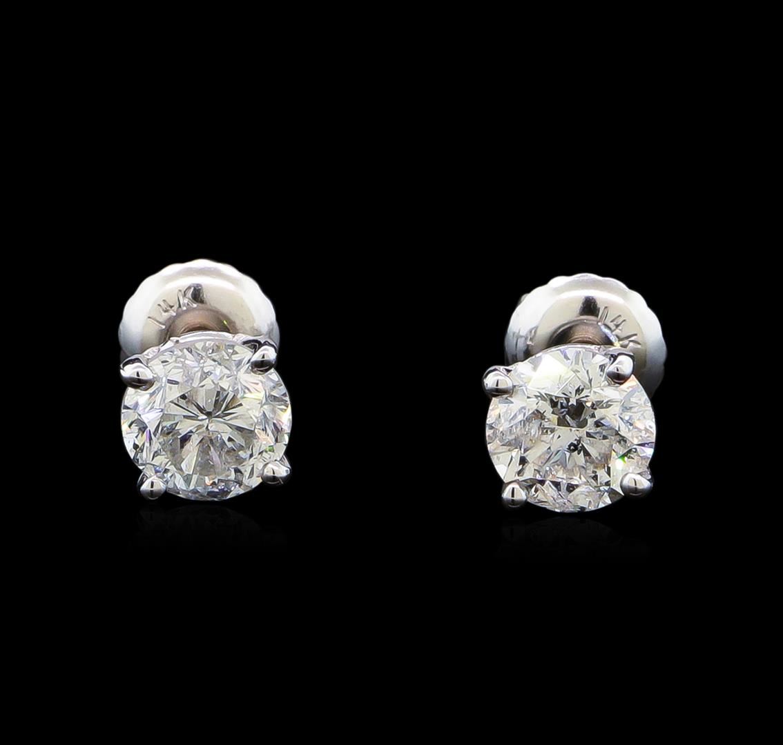 One pair electronically tested 14KT white gold lady's combination cast & assembled diamond stud earrings with threaded posts and screw-on/screw-off backs with a basket setting with a bright polish finish. Identified with markings of "14K". Condition is new, good workmanship. Containing: One prong set round brilliant cut diamond, measuring 5.37 - 5.35 x 3.48mm (depth est.) approximate weight of 0.62ct. Graded in the setting. Clarity: SI-3. Color: Good One prong set round brilliant cut diamond, measuring 5.25 - 5.24 x 3.41mm (depth est.) , 3.00.%. GTCF approximate weight of 0.60ct. Graded in the setting. Clarity: SI-3. Color: Good. Total Weight of Diamonds 1.22ct. Total Weight of Stud Earrings 1.10gm. GAS Appraised at $7,170.00.