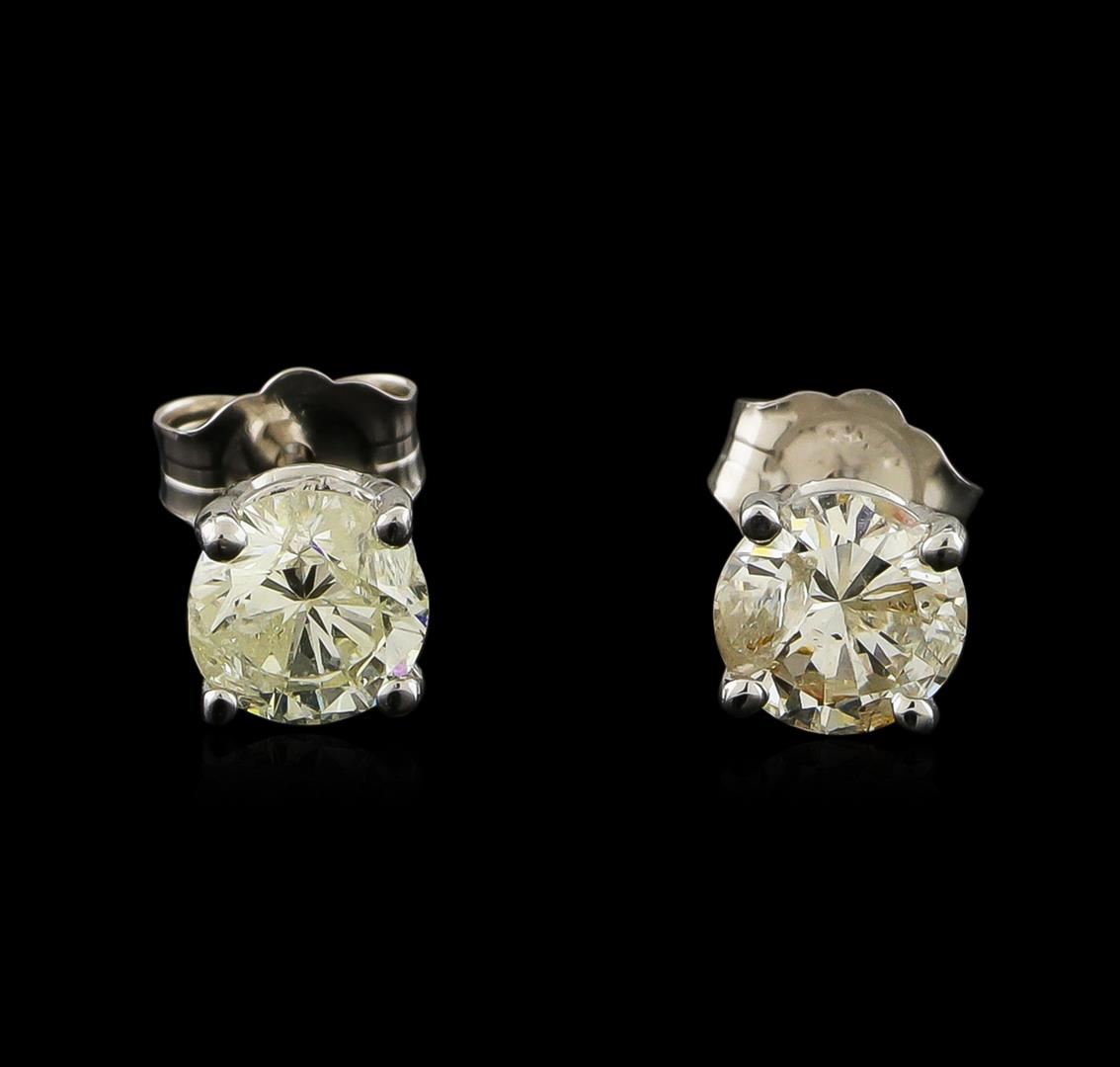 One pair electronically tested 14KT white gold lady's cast stud earrings with friction posts with a basket setting with a bright polish finish. Identified with markings of "14K". Condition is new, good workmanship. Containing: Two prong set round brilliant cut diamonds, measuring 5.46 - 5.18 x 3.46mm (depth est.) approximate total weight of 2 Stones = 1.22ct. Graded in the setting. Clarity: I-1 to I-2. Color: I - Good. Total Weight of Diamonds 1.22ct. Total Weight of Earrings 1.10gm GAS Appraised at $4,910.00.