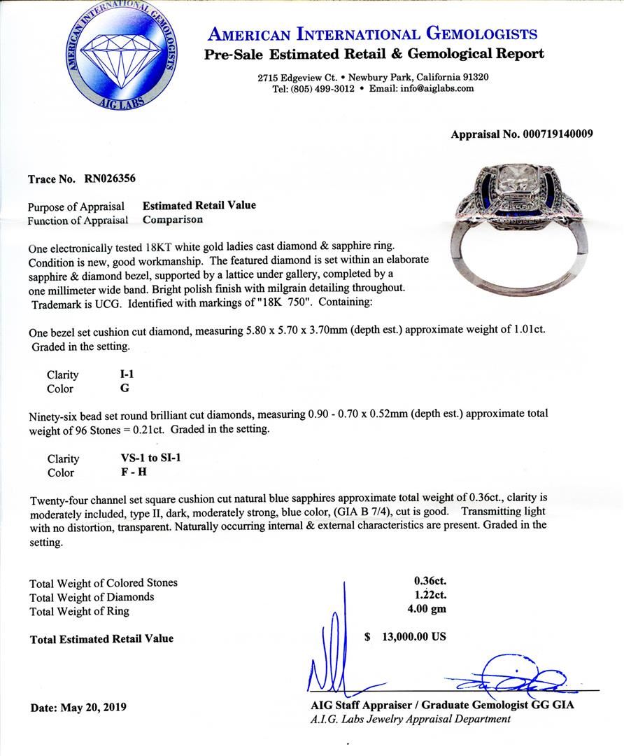 One electronically tested 18KT white gold ladies cast diamond & sapphire ring. Condition is new, good workmanship. The featured diamond is set within an elaborate sapphire & diamond bezel, supported by a lattice under gallery, completed by a one millimeter wide band. Bright polish finish with milgrain detailing throughout. Trademark is UCG. Identified with markings of "18K 750". Containing: One bezel set cushion cut diamond, measuring 5.80 x 5.70 x 3.70mm (depth est.) approximate weight of 1.01ct. Graded in the setting. Clarity I-1 Color G Ninety-six bead set round brilliant cut diamonds, measuring 0.90 - 0.70 x 0.52mm (depth est.) approximate total weight of 96 Stones = 0.21ctw. Graded in the setting. Clarity VS-1 to SI-1 Color F - H Twenty-four channel set square cushion cut natural blue sapphires approximate total weight of 0.36ctw., clarity is moderately included, type II, dark, moderately strong, blue color, (GIA B 7/4), cut is good. Transmitting light with no distortion, transparent. Naturally occurring internal & external characteristics are present. Graded in the setting. Total Weight of Colored Stones 0.36ctw. Total Weight of Diamonds 1.22ctw. Total Weight of Ring 4.00 gm