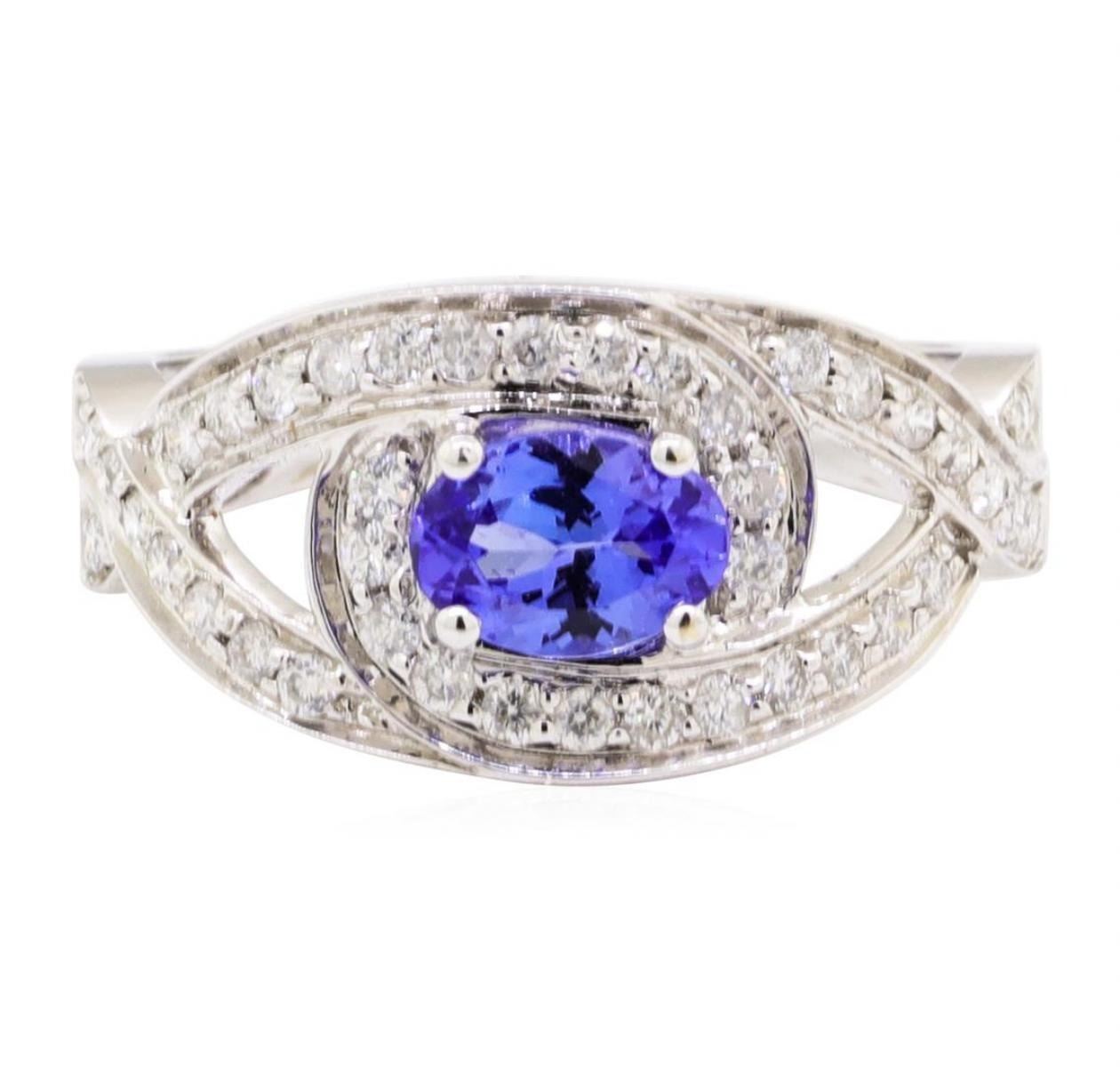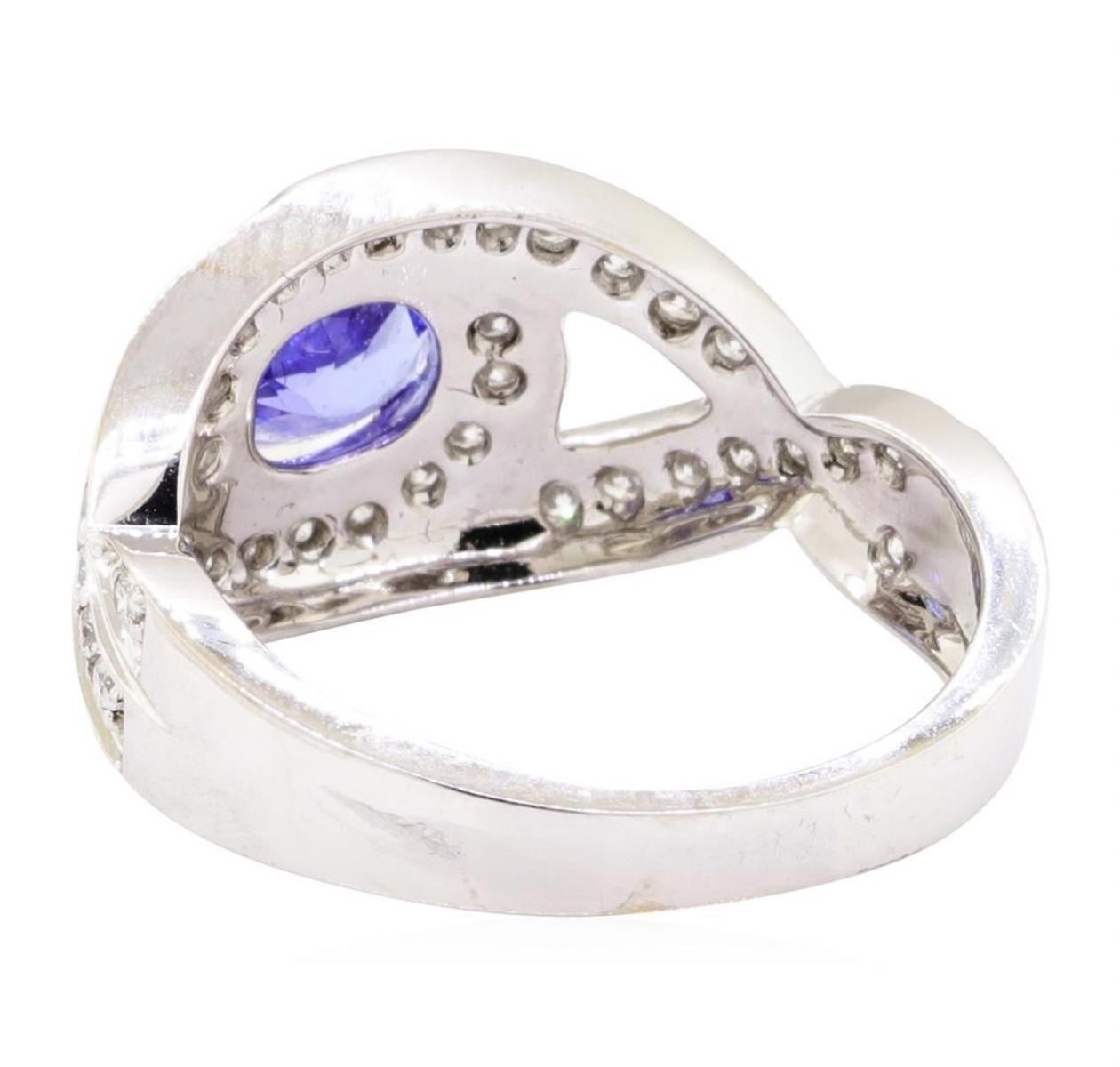 One electronically tested 14KT white gold lady's cast fashion ring with a crossover bypass shank with a bright polish finish. The featured lady's ring has a shank measuring 2.78 millimeters wide. Identified with markings of '14K'. Condition is new, good workmanship. Containing: One prong set oval modified mixed cut natural tanzanite, measuring 6.83 x 4.93 x 3.00mm, (depth est.) approximate weight of 0.75ct., clarity is eye clean, medium, moderately strong, violetish blue color, (GIA vB 5/4), cut is good. Transmitting light with no distortion, transparent. Colored gemstones are presumed to have been subjected to commonly used enhancement processes. Graded in the setting. Forty prong set round brilliant cut diamonds, measuring 1.50 - 1.45 x 0.92mm (depth est.) approximate total weight of 40 Stones = 0.47ct. Graded in the setting. Color G - I Clarity SI-2 to I-1 Cut Good. Total Weight of Colored Stones 0.75ct.. Total Weight of Diamonds 0.47ct.. Total Weight of Ring 4.70gm GAS Appraised at $2365.00. GAS Appraised.