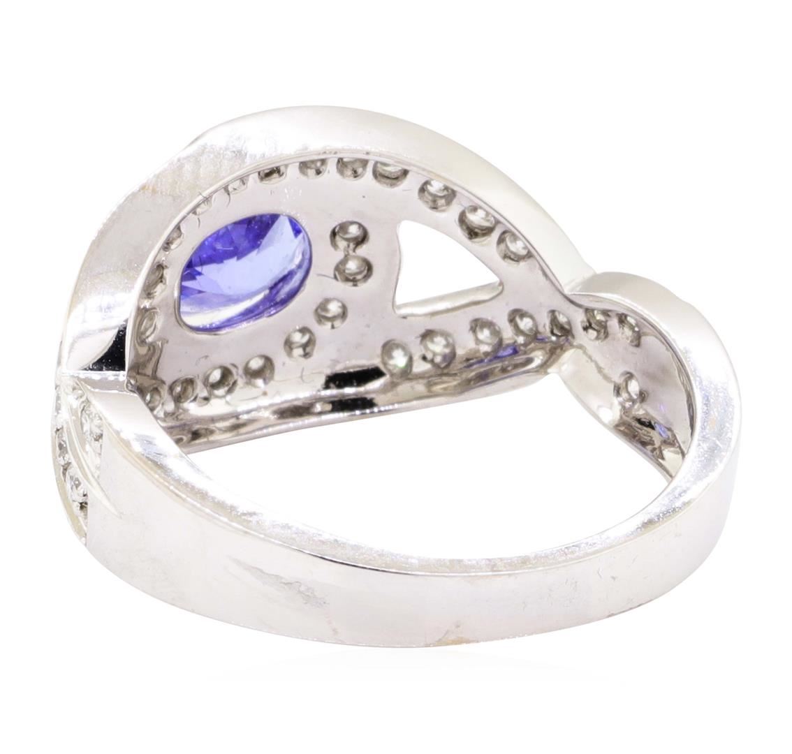 One electronically tested 14KT white gold lady's cast fashion ring with a crossover bypass shank with a bright polish finish. The featured lady's ring has a shank measuring 2.78 millimeters wide. Identified with markings of '14K'. Condition is new, good workmanship. Containing: One prong set oval modified mixed cut natural tanzanite, measuring 6.83 x 4.93 x 3.00mm, (depth est.) approximate weight of 0.75ct., clarity is eye clean, medium, moderately strong, violetish blue color, (GIA vB 5/4), cut is good. Transmitting light with no distortion, transparent. Colored gemstones are presumed to have been subjected to commonly used enhancement processes. Graded in the setting. Forty prong set round brilliant cut diamonds, measuring 1.50 - 1.45 x 0.92mm (depth est.) approximate total weight of 40 Stones = 0.47ct. Graded in the setting. Color G - I Clarity SI-2 to I-1 Cut Good. Total Weight of Colored Stones 0.75ct.. Total Weight of Diamonds 0.47ct.. Total Weight of Ring 4.70gm GAS Appraised at $2365.00. GAS Appraised.