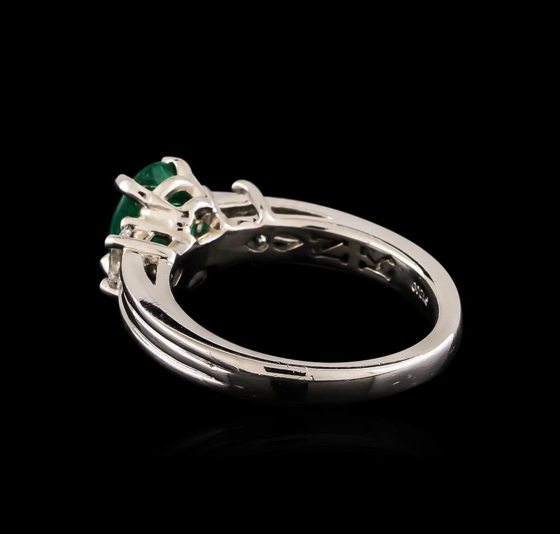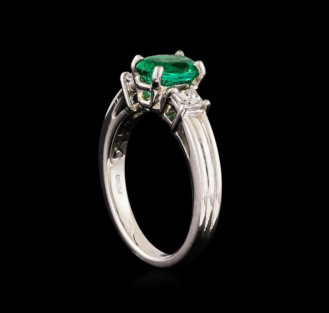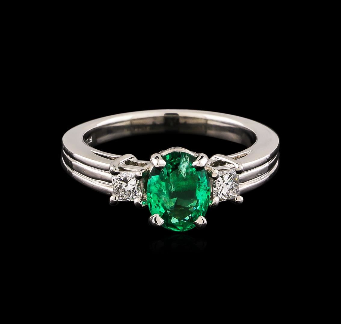 One electronically tested platinum lady's cast 3-stone ring with a cathedral shank with a bright polish finish. The featured lady's ring has a shank measuring 2.59 millimeters wide. Identified with markings of "PT 900". Condition is new, good workmanship. Containing: One prong set oval modified brilliant cut natural emerald, measuring 8.02 x 6.16 x 4.00mm, 8%. bulge factor, approximate weight of 1.22ct., clarity is moderately included, type III, medium, moderately strong, green color, (GIA G 5/4), cut is very good. Transmitting light somewhat diffusely, transparent to translucent. Indications of oil residue. Graded in the setting. Two prong set princess cut diamonds, measuring 3.10 x 3.06 x 2.30mm (depth est.) approximate total weight of 2 Stones = 0.36ct. Graded in the setting. Clarity: VS-1 to VS-2 . Color: G - Good. Total Weight of Colored Stones 1.22ct.. Total Weight of Diamonds 0.36ct.. Total Weight of Ring 7.50gm. GAS Appraised at $5,890.00.