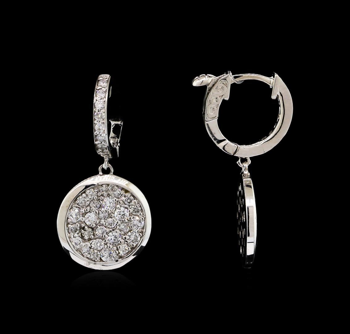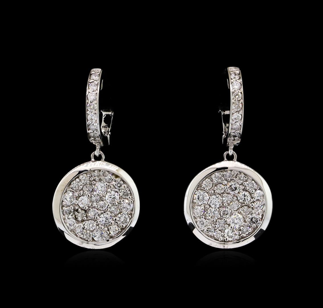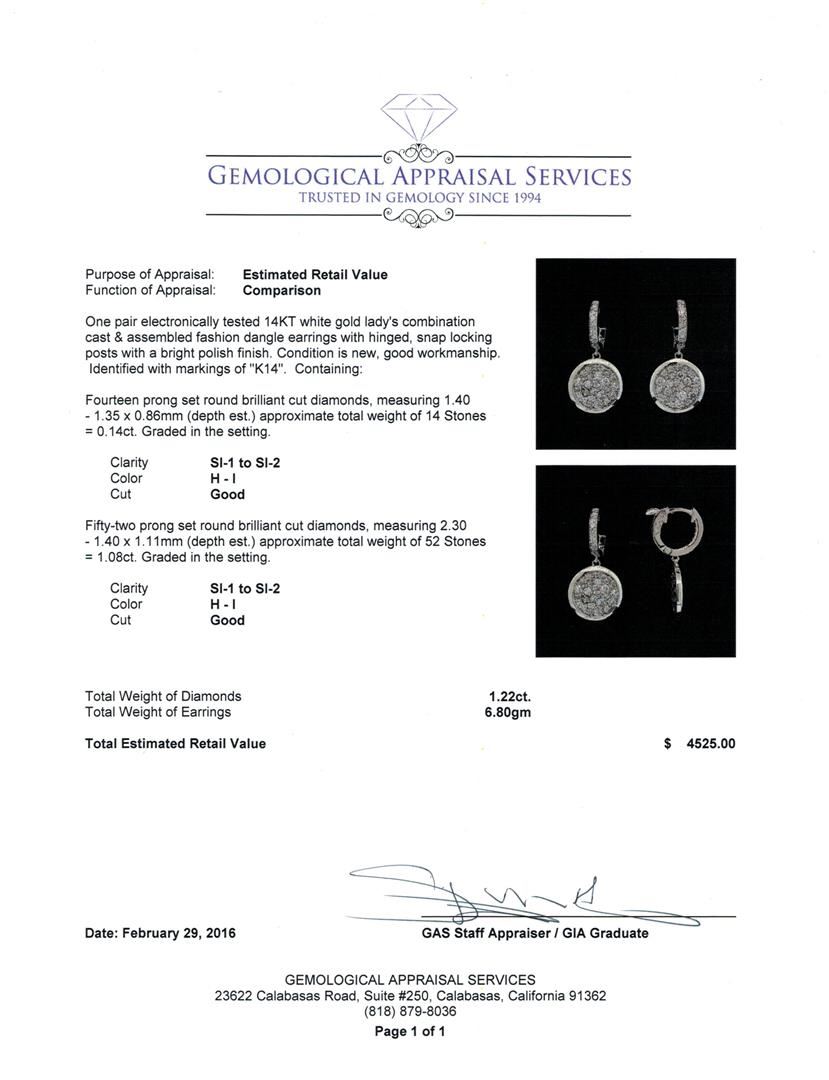 One pair electronically tested 14KT white gold lady's combination cast & assembled fashion dangle earrings with hinged, snap locking posts with a bright polish finish. Identified with markings of "K14". Condition is new, good workmanship. Containing: Fourteen prong set round brilliant cut diamonds, measuring 1.40 - 1.35 x 0.86mm (depth est.) approximate total weight of 14 Stones = 0.14ct. Graded in the setting. Clarity: SI-1 to SI-2. Color: H - I. Cut Good Fifty-Two prong set round brilliant cut diamonds, measuring 2.30 - 1.40 x 1.11mm (depth est.) approximate total weight of 52 Stones = 1.08ct. Graded in the setting. Clarity: SI-1 to SI-2. Color: H - I. Cut Good. Total Weight of Diamonds 1.22ct. Total Weight of Earrings 6.80gm. GAS Appraised at $4,525.00.