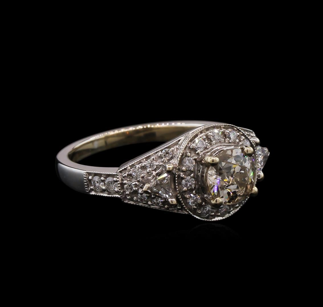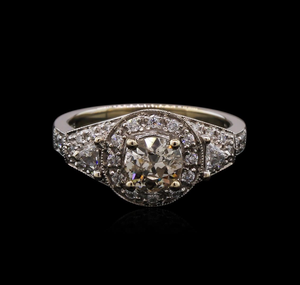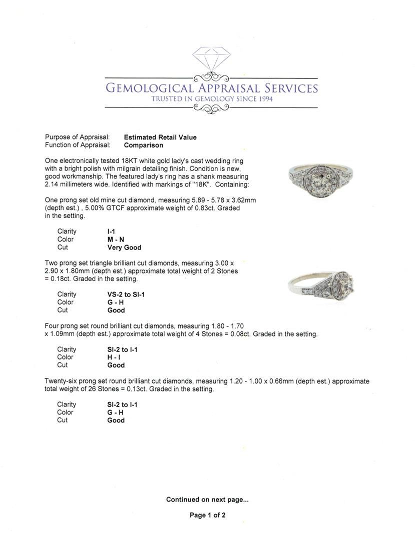 One electronically tested 18KT white gold lady's cast wedding ring with a bright polish with milgrain detailing finish. The featured lady's ring has a shank measuring 2.14 millimeters wide. Identified with markings of "18K". Condition is new, good workmanship. Containing: One prong set old mine cut diamond, measuring 5.89 - 5.78 x 3.62mm (depth est.) , 5.00.%. GTCF approximate weight of 0.83ct. Graded in the setting. Clarity: I-1. Color: M - N. Cut Very Good Two prong set triangle brilliant cut diamonds, measuring 3.00 x 2.90 x 1.80mm (depth est.) approximate total weight of 2 Stones = 0.18ct. Graded in the setting. Clarity: VS-2 to SI-1. Color: G - H. Cut Good Four prong set round brilliant cut diamonds, measuring 1.80 - 1.70 x 1.09mm (depth est.) approximate total weight of 4 Stones = 0.08ct. Graded in the setting. Clarity: SI-2 to I-1. Color: H - I. Cut Good Twenty-Six prong set round brilliant cut diamonds, measuring 1.20 - 1.00 x 0.66mm (depth est.) approximate total weight of 26 Stones = 0.13ct. Graded in the setting. Clarity: SI-2 to I-1. Color: G - Good. Total Weight of Diamonds 1.22ct. Total Weight of Ring 5.80gm. GAS Appraised at $5,750.00.